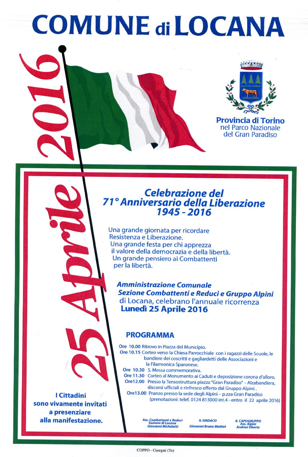 | Organizzazione | Comune di Locana, Sezione Combattenti e Reduci e Gruppo Alpini |