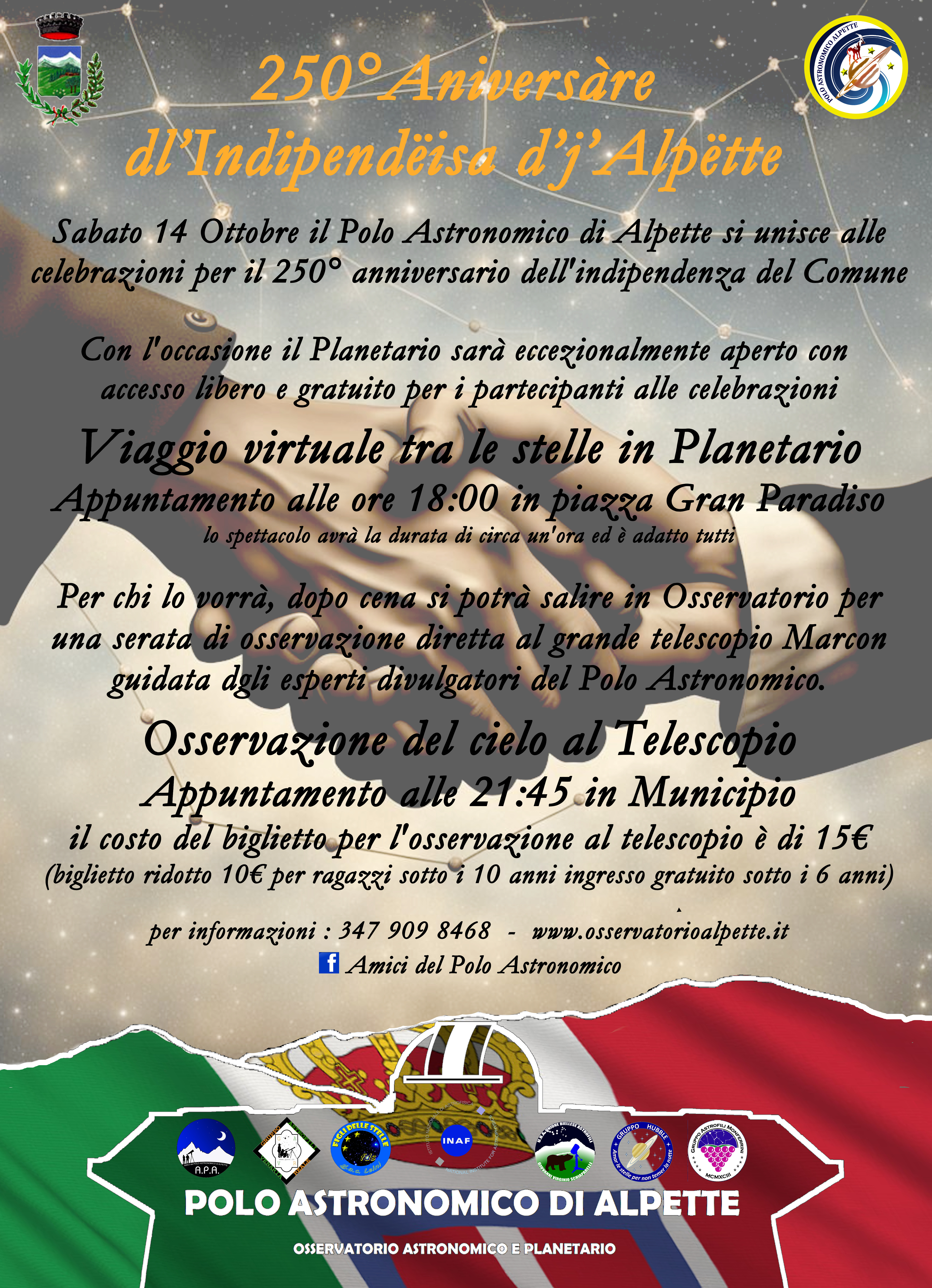 Si inoltra in allegato anche menù della cena del 14 ottobre e programma del Polo Astronomico dedicato all'evento dell'Indipendenza, visita al planetario digitale e osservazione delle stelle.