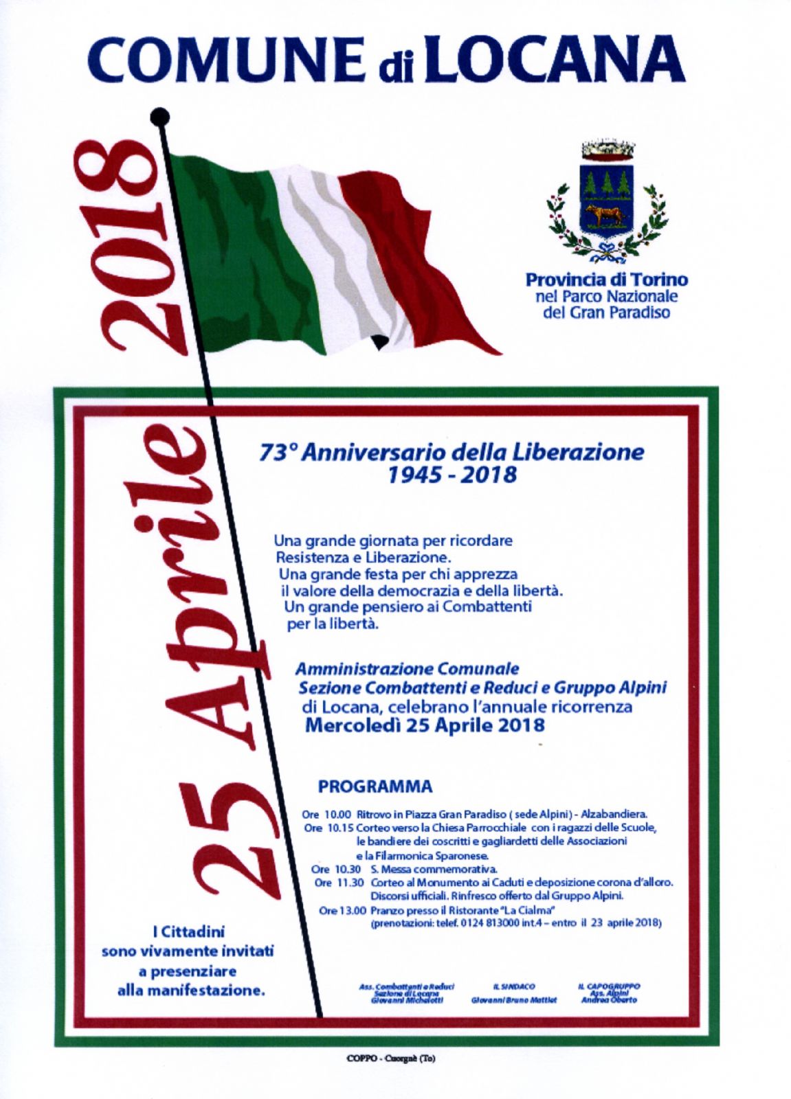 | Organizzazione | Comune di Locana, Sezione Combattenti e Reduci e Gruppo Alpini di Locana |