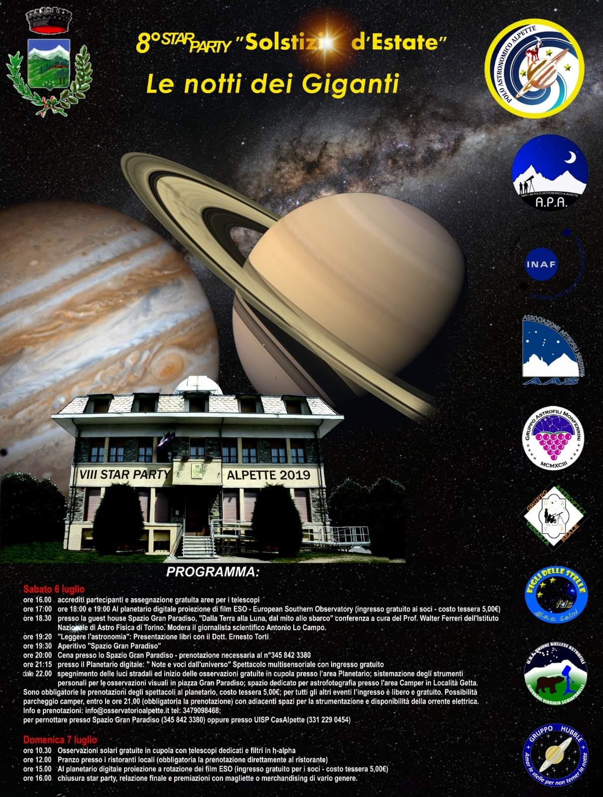 ore 17:00 ore 18:00 e 19:00 Al planetario digitale proiezione di film ESO - European Southern Observatory (ingresso gratuito ai soci - costo tessera 5,00€) presso la guest house Spazio Gran Paradiso, "Dalla Terra alla Luna, dal mito allo sbarco" conferenza a cura del Prof. Walter Ferreri dell'istituto Naziaggale di Astro Fisica di Torino. Modera il giornalista scientifico Antonio Lo Campo.