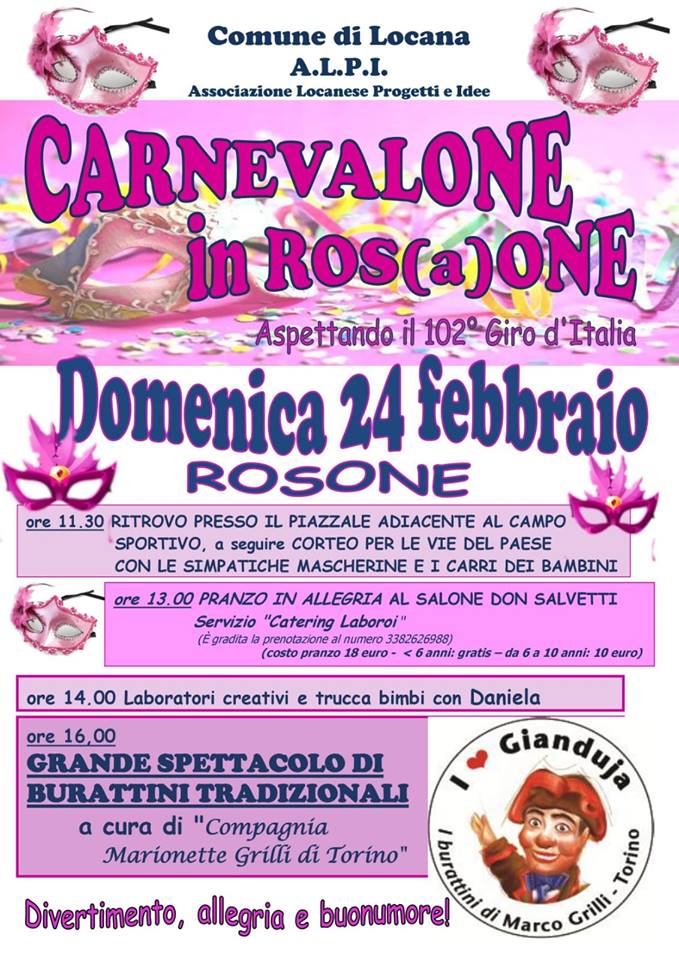 Ore 11.30 Ritrovo presso il Piazzale adiacente al campo sportivo, a seguire corteo per le vie del paese con le simpatiche mascherine e i carri dei bambini.