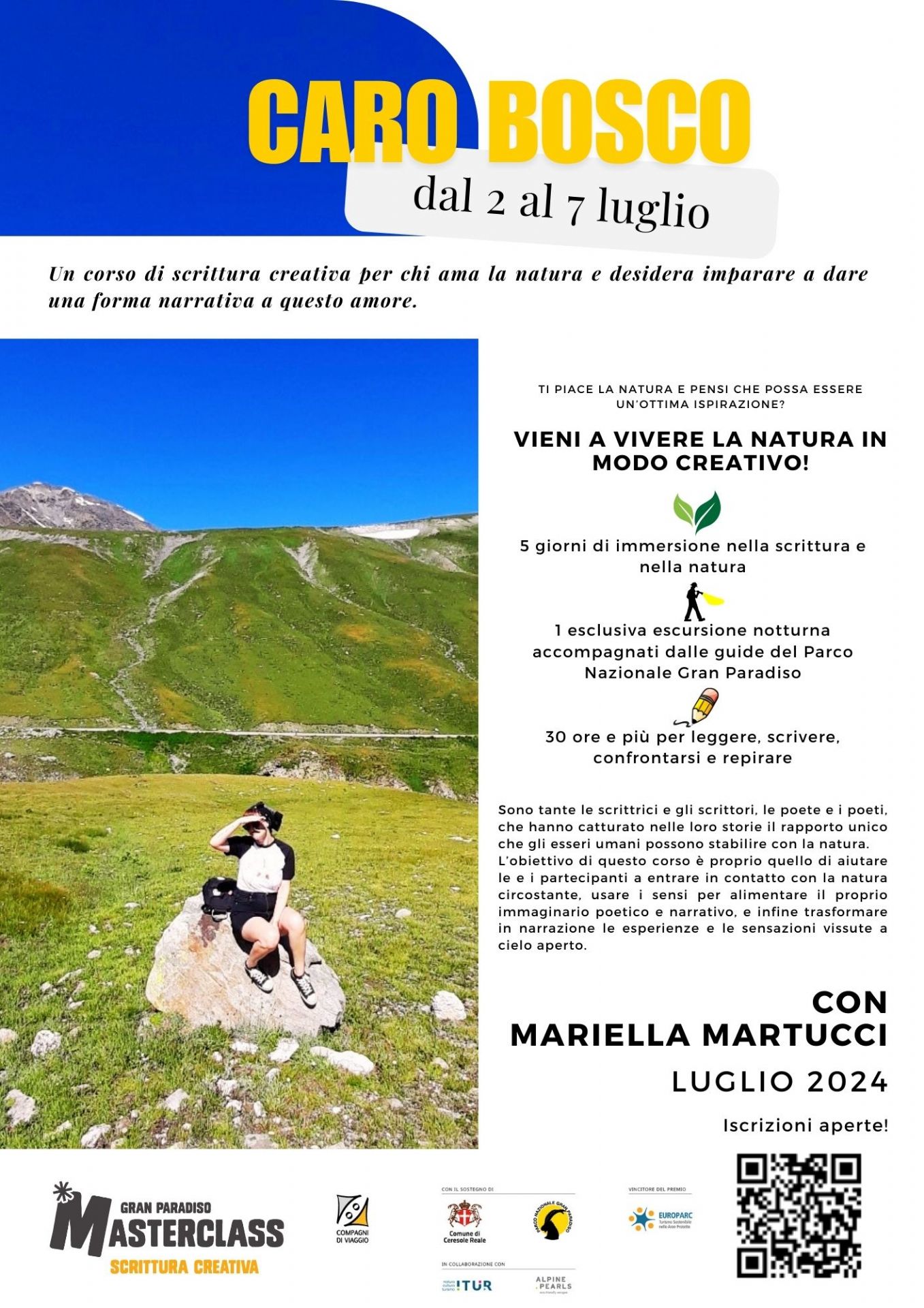 Un corso di scrittura creativa con MARIELLA MARTUCCI, per chi ama la natura e desidera imparare a dare una forma narrativa a questo amore. Sono tante le scrittrici e gli scrittori, le poete e i poeti, che hanno catturato nelle loro storie il rapporto unico che gli esseri umani possono stabilire con la natura. L'obiettivo di questo corso è proprio quello di aiutare le e i partecipanti a entrare in contatto con la natura circostante, usare i sensi per alimentare il proprio immaginario poetico e narrativo, e infine trasformare in narrazione le esperienze e le sensazioni vissute a cielo aperto.