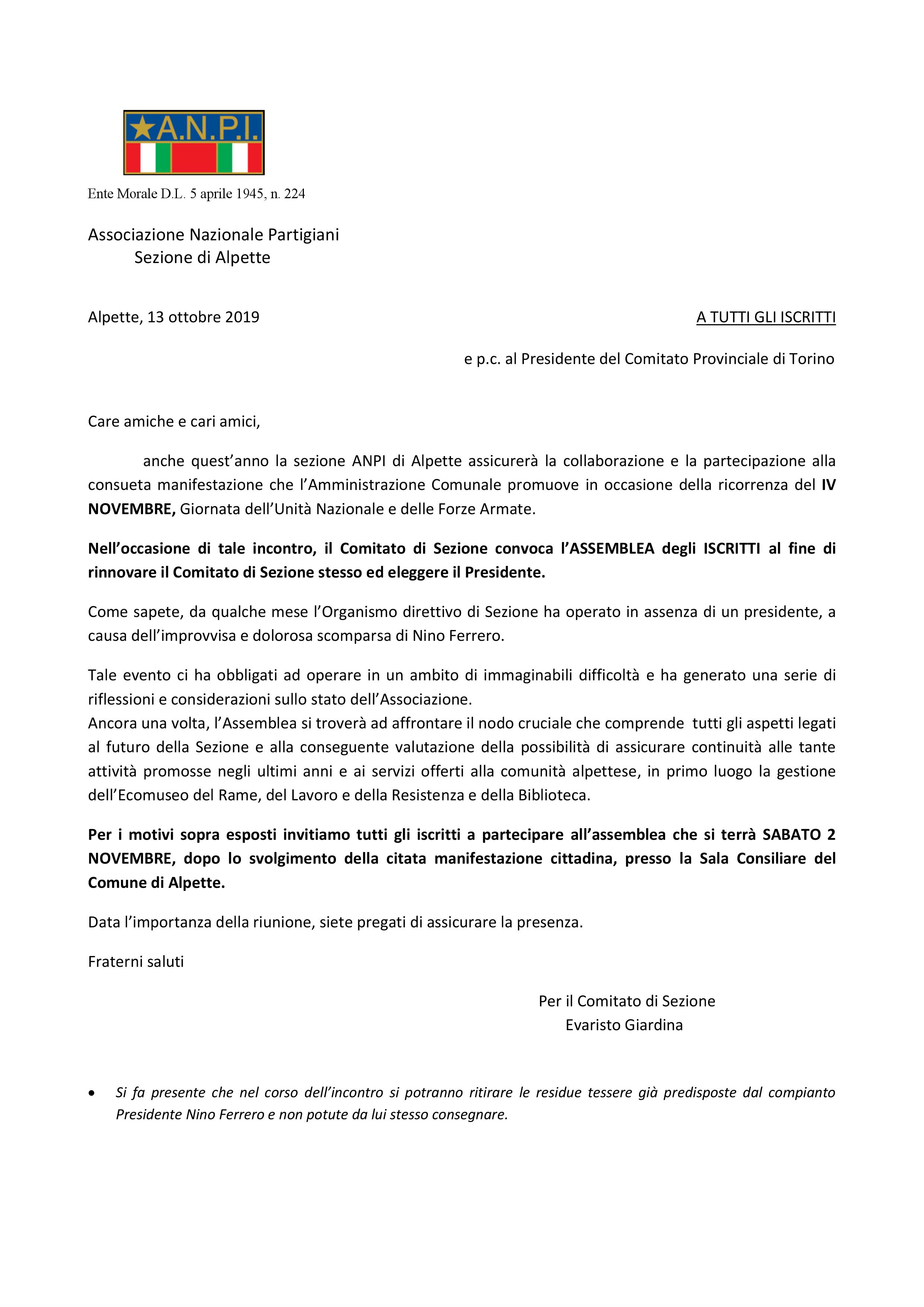 Per i motivi sopra esposti invitiamo tutti gli iscritti a partecipare all’assemblea che si terrà SABATO 2 NOVEMBRE, dopo lo svolgimento della citata manifestazione cittadina, presso la Sala Consiliare del Comune di Alpette.