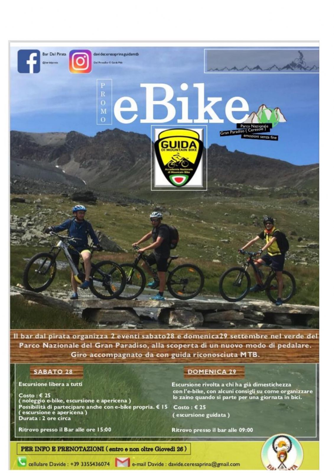 sabato 28 escursione per tutti con possibilità di noleggio e-bike e apericena ritrovo ore 15 al Bar Dal Pirata, durata 2 ore circa; costo 25€ (escursione, noleggio e apericena), 15€ (escursione e apericena)