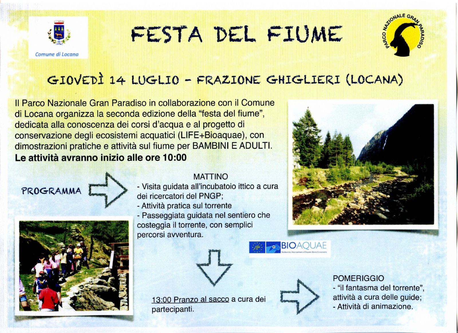 Il Parco Nazionale del Gran Paradiso in collaborazione con il Comune di Locana organizza la seconda edizione della "Festa del Fiume", dedicata alla conoscenza dei corsi d'acqua e al progetto di conservazione degli ecosistemi acquatici (LIFE-Bioaquae), con dimostrazioni pratiche e attività sul fiume per bambini e adulti.
