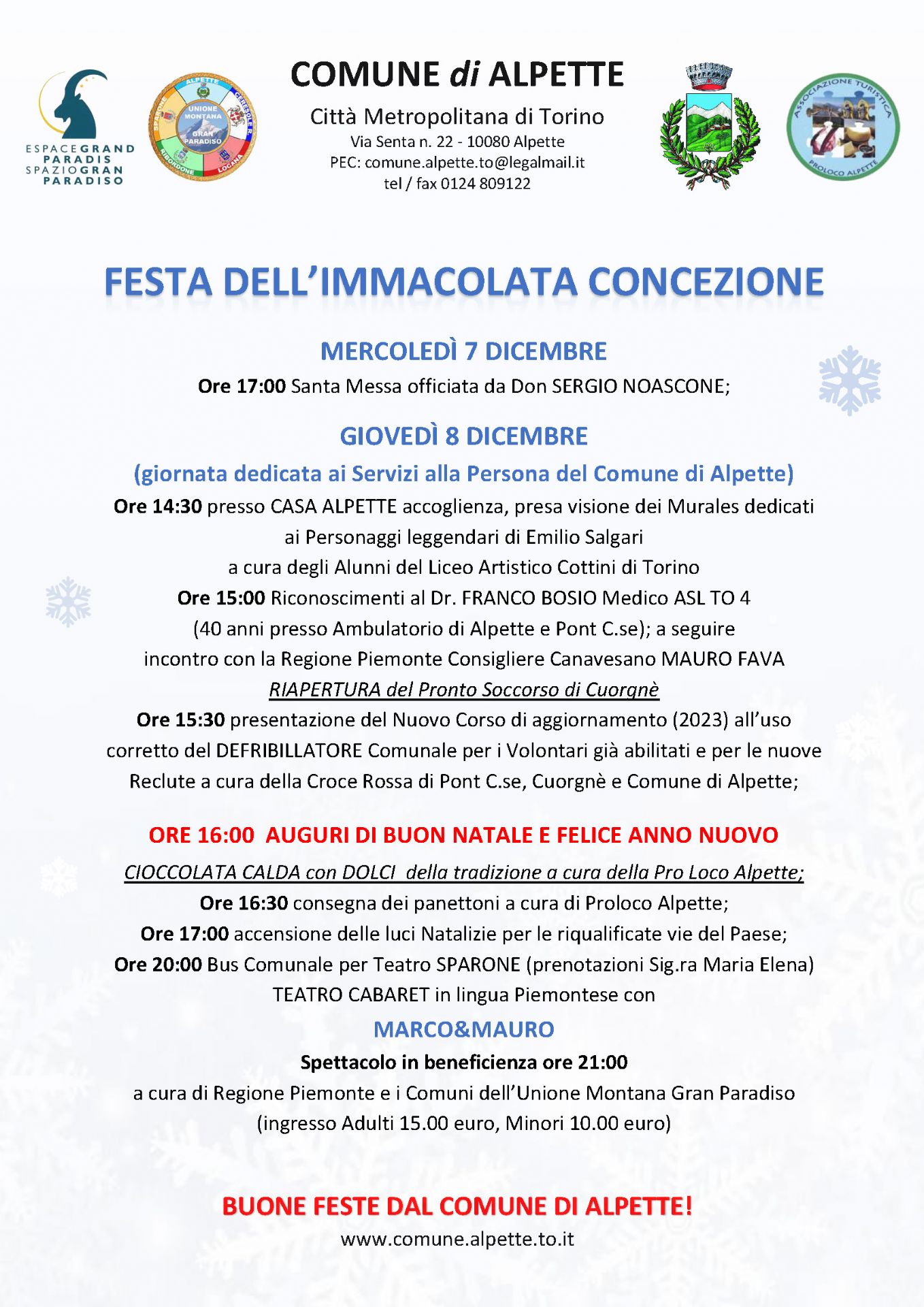 Il Comune di Alpette, in collaborazione con la Pro Loco di Alpette presenta il programma della Festa dell'Immacolata Concezione 2022: