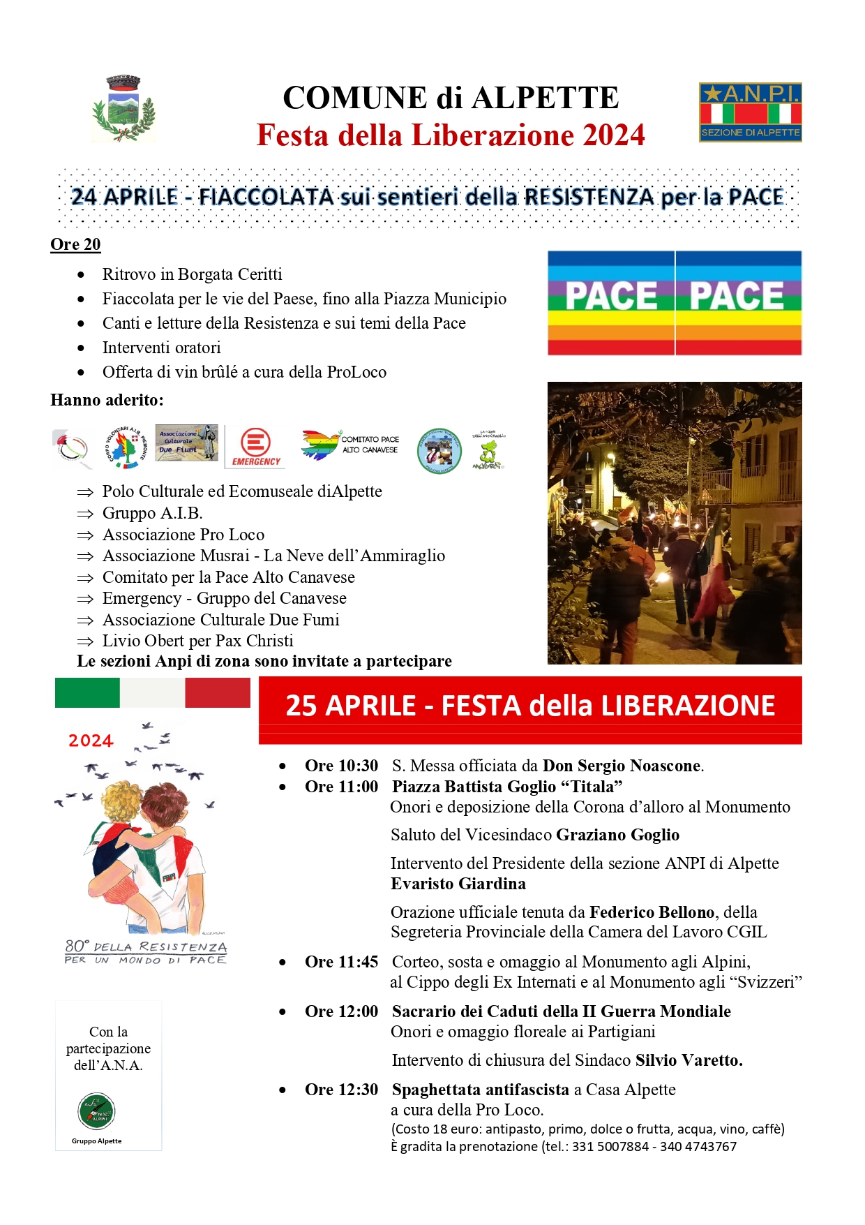 • Ore 12:30 Spaghettata antifascista a Casa Alpette a cura della Pro Loco.