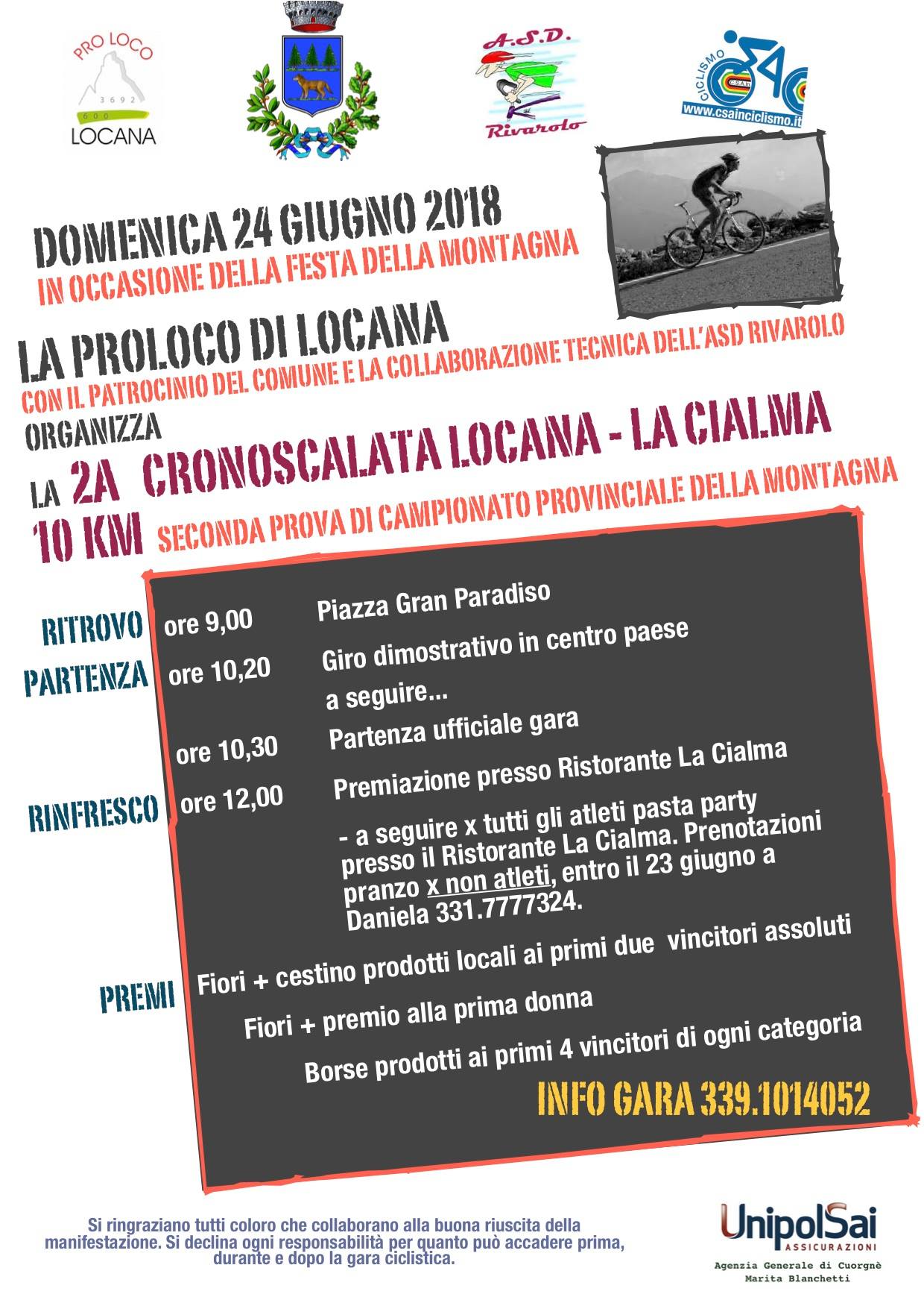 12.00-12.30 Premiazione Cronoscalata e pranzo presso il Ristorante la Cialma (prenotazioni pranzo entro 23 Giugno, telefonare a Daniela 331,7777324)