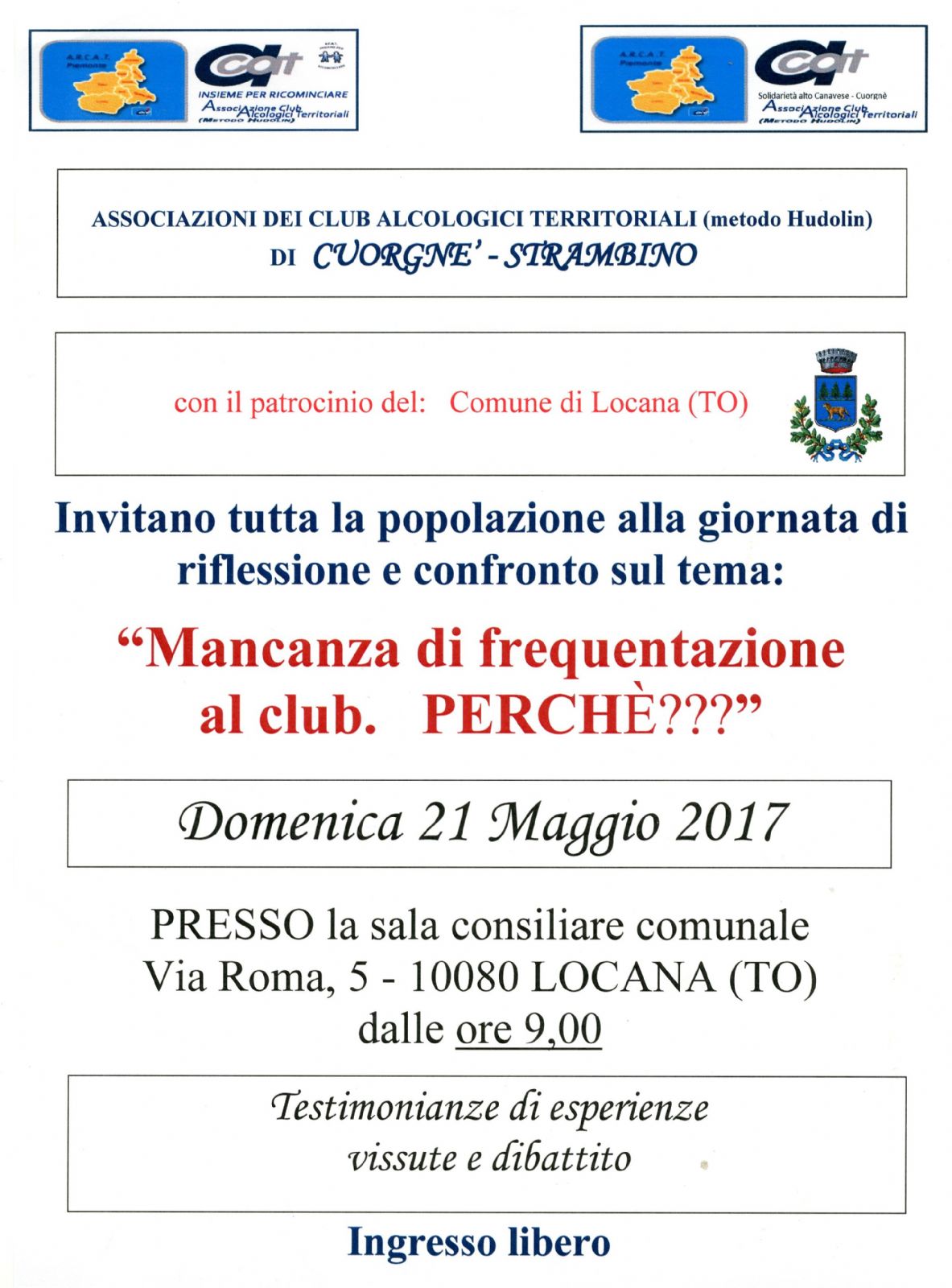 | Organizzazione | Associazioni dei Club Alcologici Territoriali (metodo Hudolin) di Cuorgnè - Strambino con il Patrocinio del Comune di Locana |