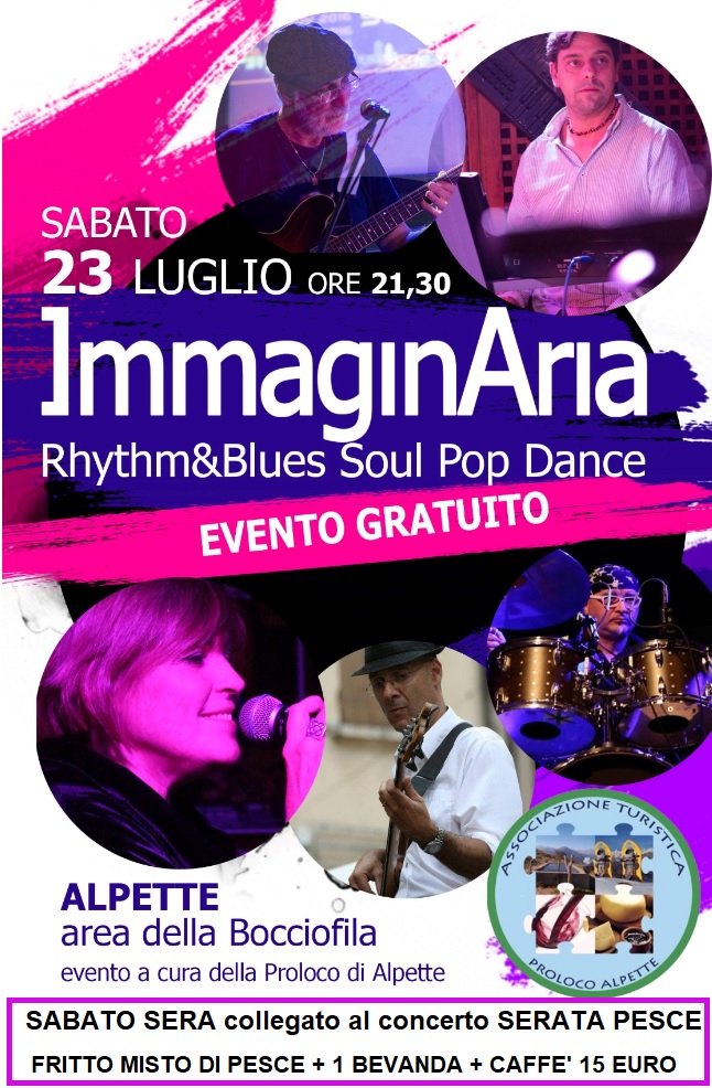 Sabato 23 luglio alle ore 21.30 "immaginaria - rhythm&blues soul pop dance" presso l'area della bocciofila, evento a cura della proloco di alpette (ingresso gratuito).