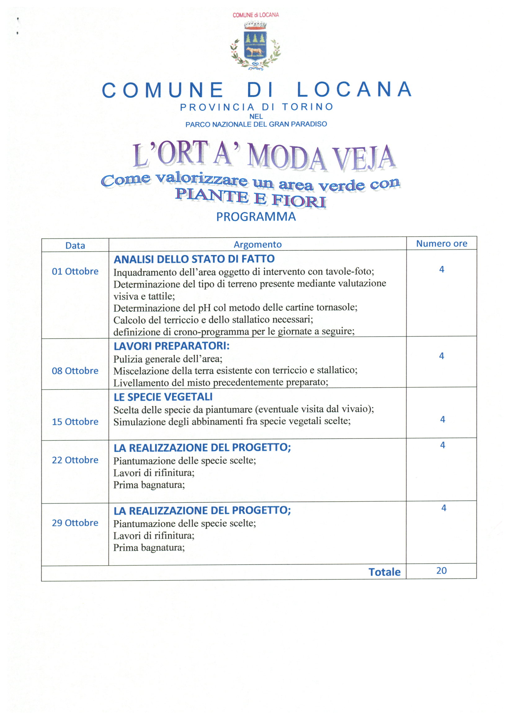 Il corso della durata di 20 ore si svolgerà nella sala consigliare del Comune di Locana nelle mattinate di sabato: