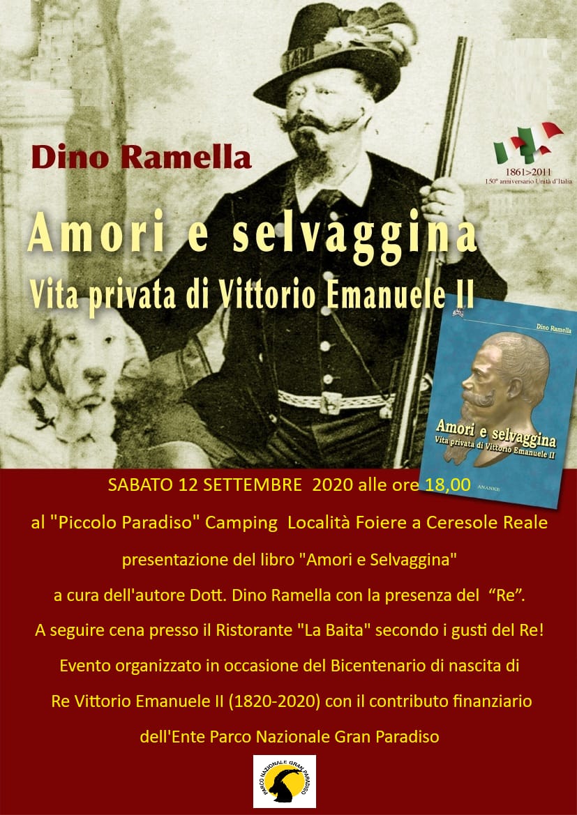 Sabato 12 settembre alle ore 18 al Camping "Piccolo Paradiso", in località Foiere, avrà luogo la presentazione del libro "Amori e Selvaggina – vita privata di Vittorio Emanuele II".