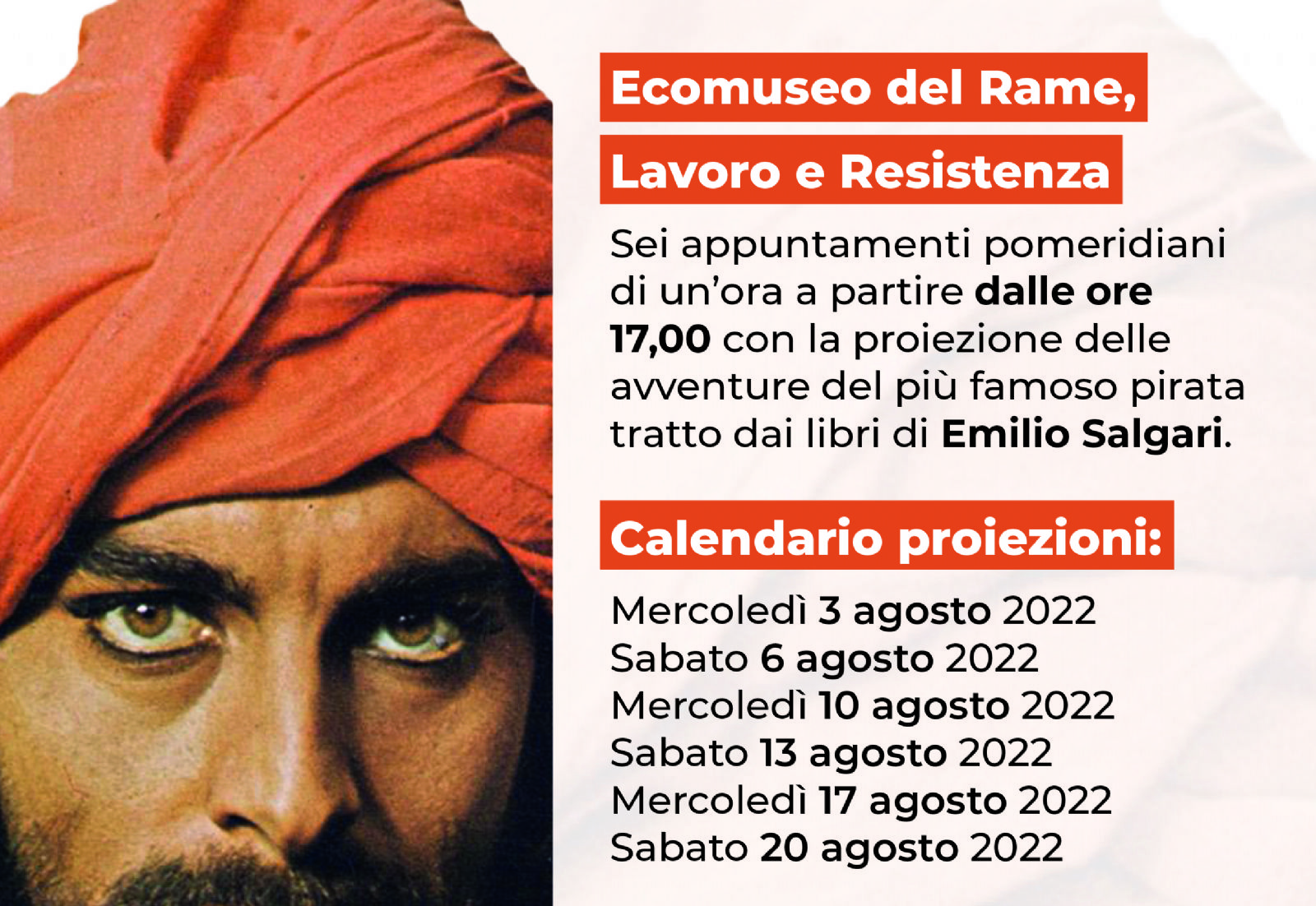 Sei appuntamenti pomeridiani di un'ora a partire dalle ore 17.00 con la proiezione delle avventure del più famoso pirata tratto dai libri di Emilio Salgari, presso l'ecomuseo del rame, lavoro e resistenza.