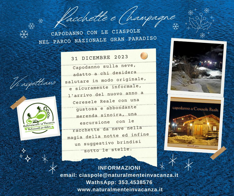Capodanno sulla neve, adatto a chi desidera salutare in modo originale, e sicuramente informale, l'arrivo del nuovo anno a Ceresele Reale con una gustosa e abbondante merenda sinoira, una escursione con le racchette da neve nella magia della notte ed infine un suggestivo brindisi sotto le stelle.