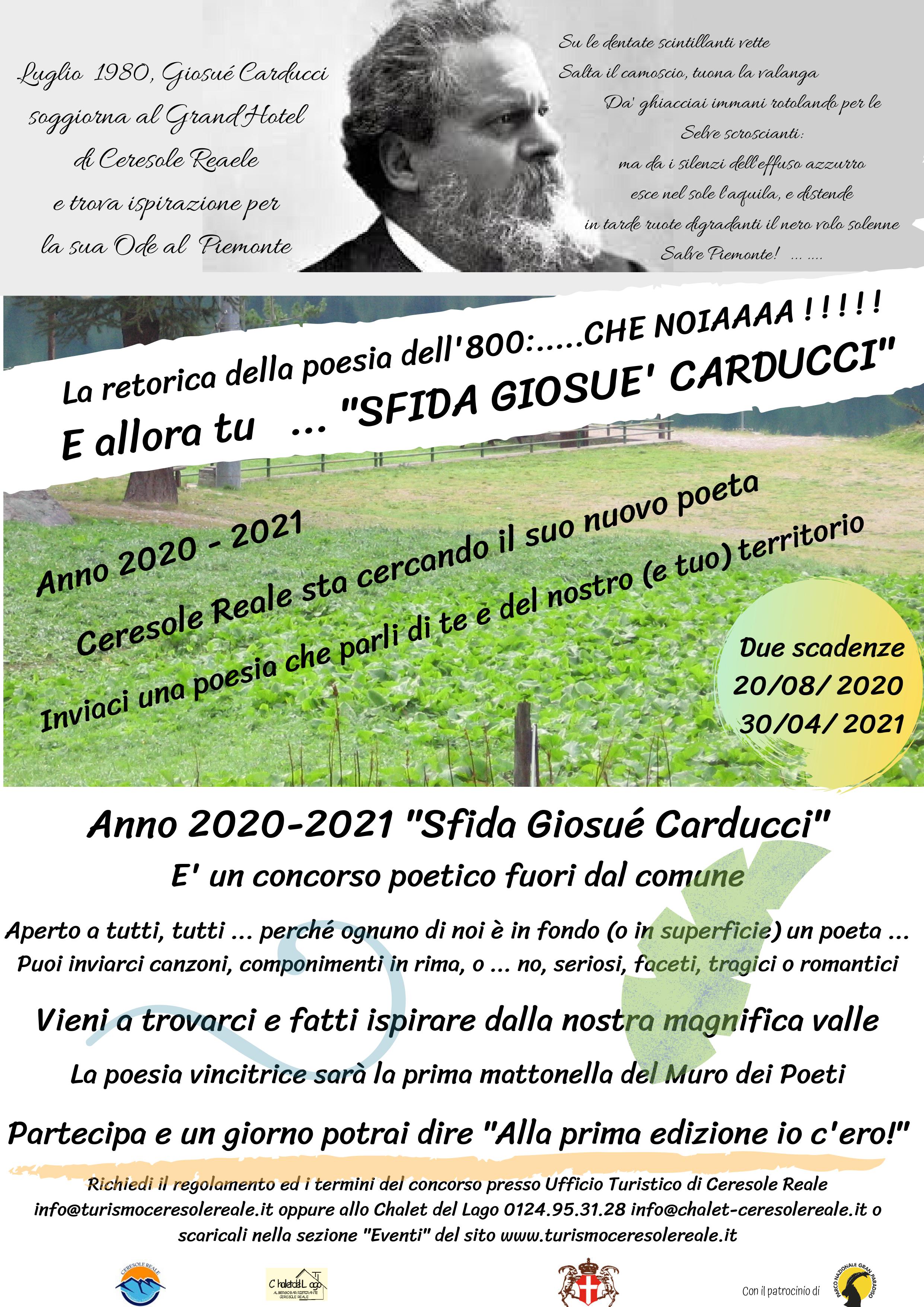 Nel luglio 1890, Giosué Carducci soggiorna al Grand Hotel di Ceresole Reaele e trova ispirazione per la sua Ode al Piemonte: nel luglio 2020 l’Associazione Ceresole Reale Turismo indice la prima edizione del Concorso Letterario “Sfida Giosué Carducci!".