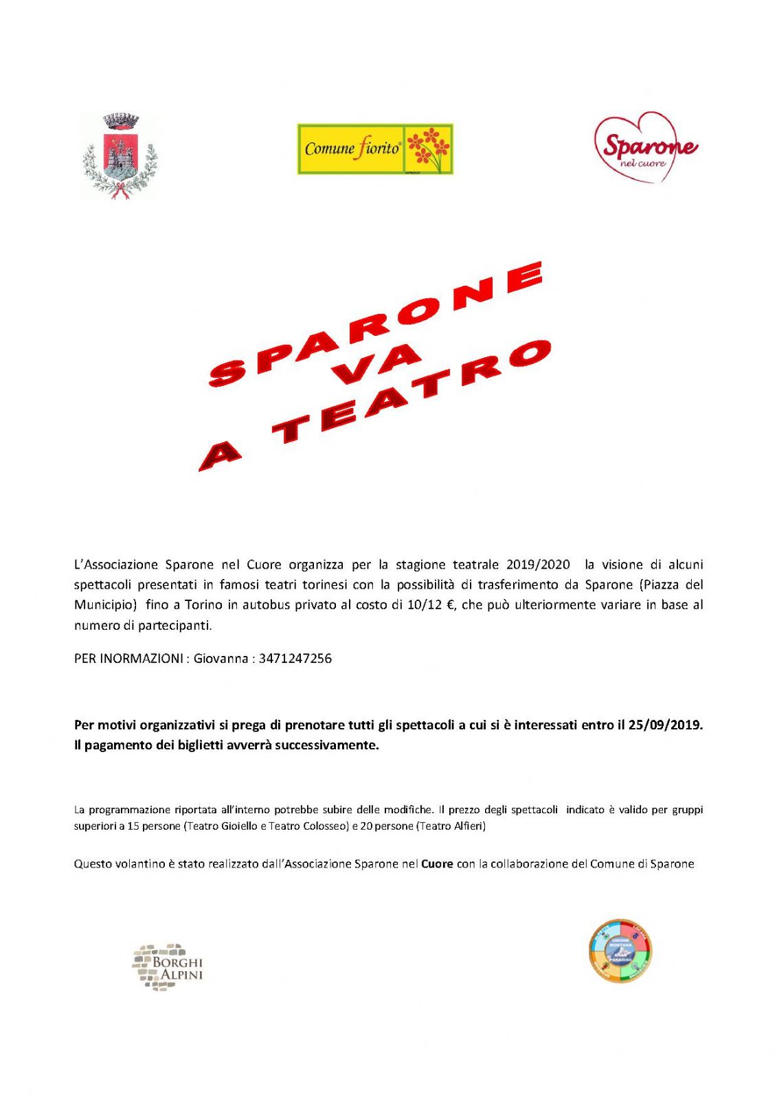 L'Associazione Sparone nel Cuore in collaborazione con il Comune di Sparone organizzano per la stagione teatrale 2019/2020 la visione di alcuni spettacoli presentati in famosi teatri torinesi (vedi locandina)
