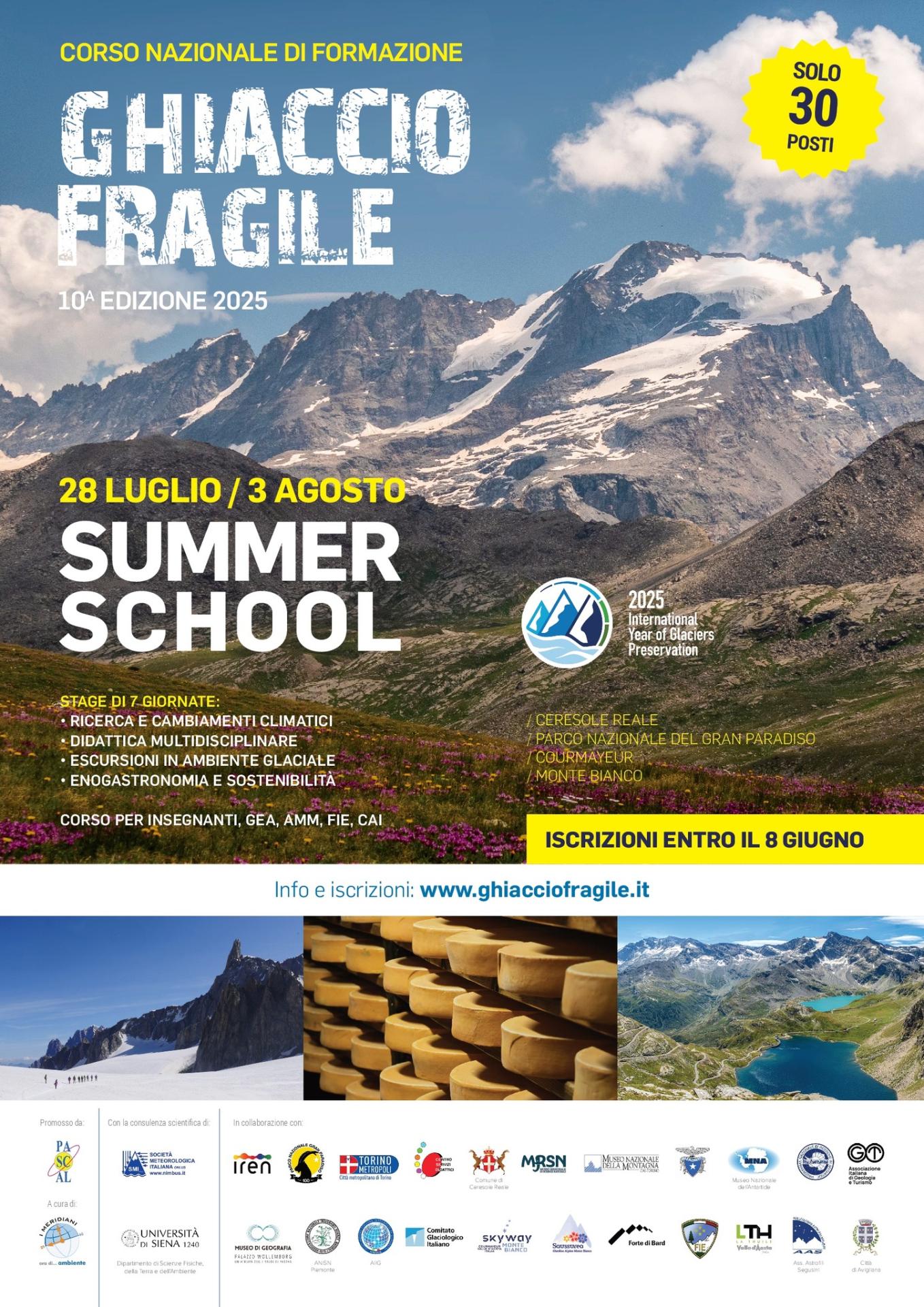 Decima edizione della Summer School "Ghiaccio Fragile", che si terrà questa estate in due località di straordinario interesse naturalistico: il Parco Nazionale Gran Paradiso e il Massiccio del Monte Bianco.
