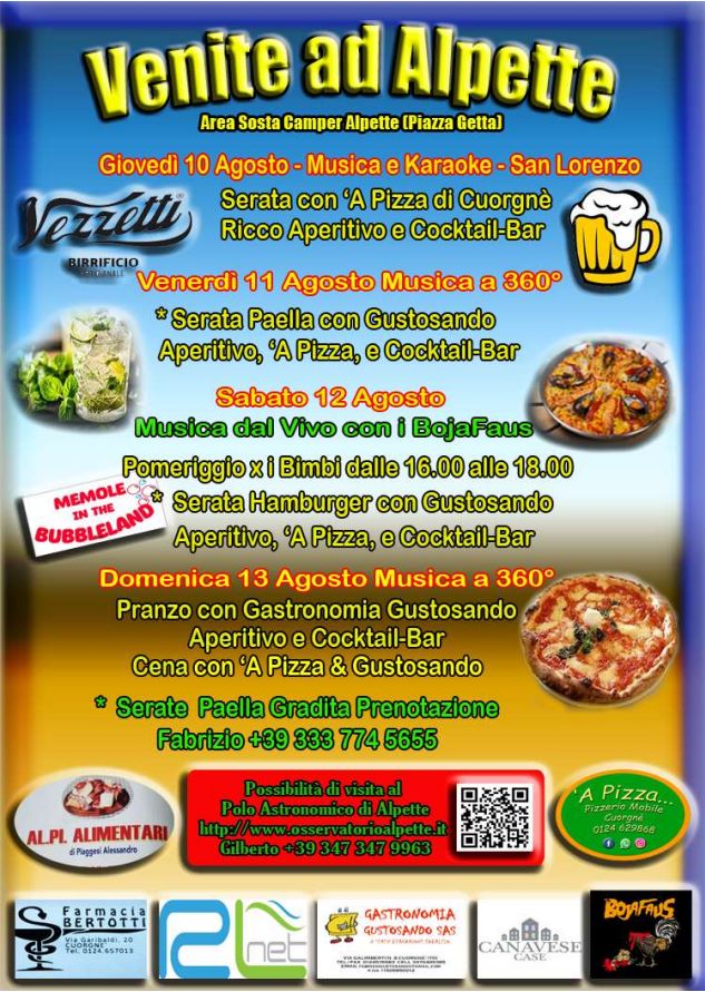 Si segnala l'evento "Venite ad alpette" che si terrà dal 10 al 13 agosto presso l'area sosta camper in Piazza Getta.