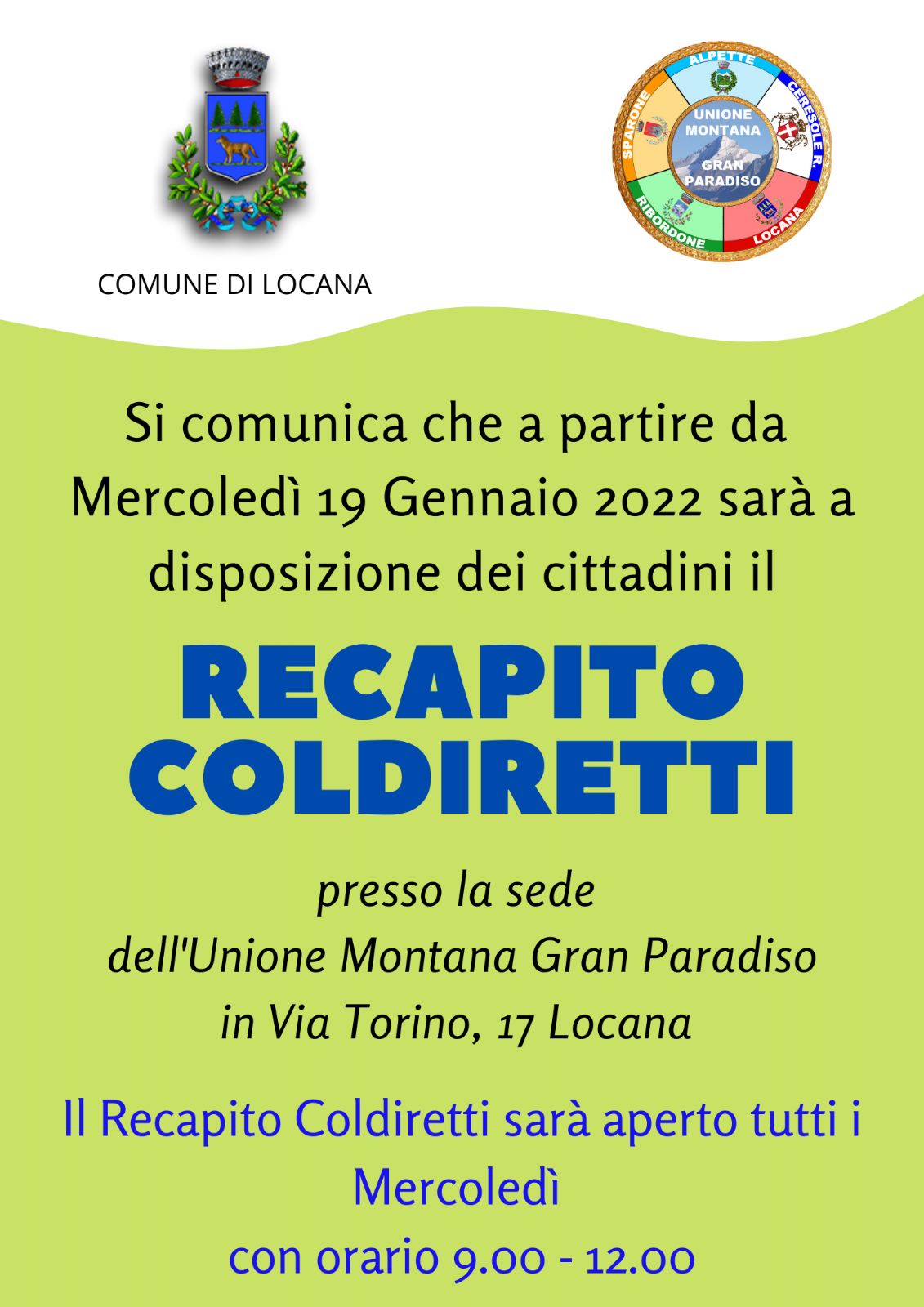 Presso la sede dell'Unione Montana Gran Paradiso, in Via Torino n. 17 Locana, a partire dal 19 Gennaio 2022 sarà attivo il Recapito Coldiretti.
