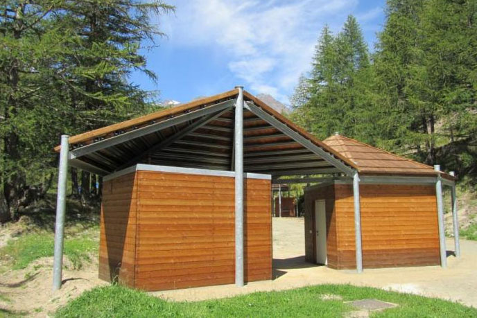 L’area attrezzata comprende una zona dedicata a parcheggio con complessivamente 30 posti auto circa, una zona servizi e accoglienza e, sulla sponda opposta del torrente Orco, un’area pic-nic con tavolini, barbecue, fontane e alcune strutture ludiche per i più piccoli