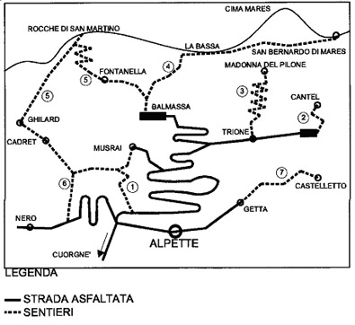 Si segue la strada carrozzabile Alpette-Trione sino alla località Costa dalla quale, svoltando a sinistra, si prosegue per una strada sterrata di recente costruzione sino alla borgata Moserai. Lungo la strada sterrata si incontra a sinistra un sentiero per la frazione Nero anticamente usata dai Celti per le processioni religiose chiamate COURS che collegava la località Brujat con Moserai e Trione.