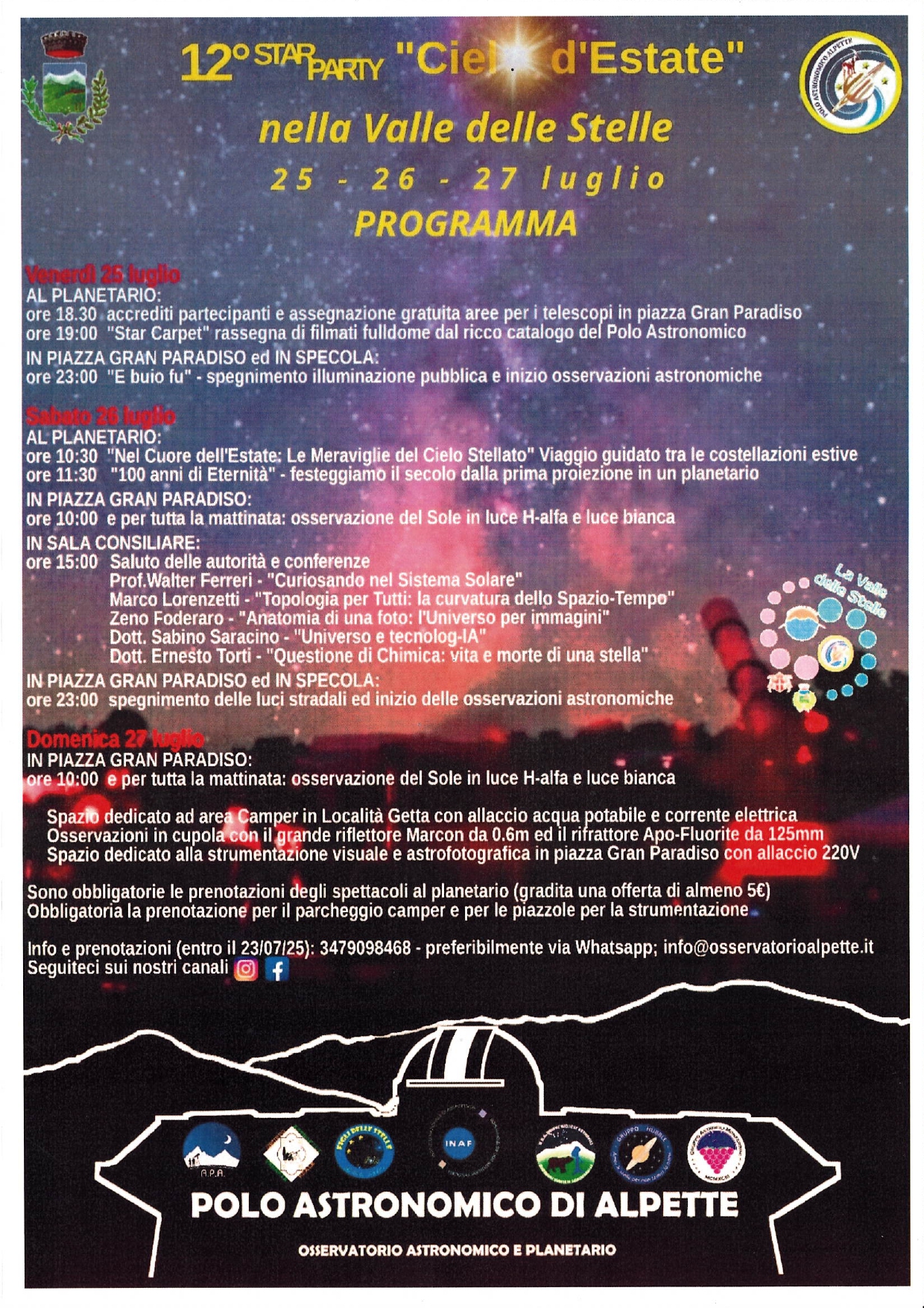 L'Associazione "Amici del Polo Astronomico" di Alpette organizza il 12° Star Party, rinnovando e ampliando l'offerta divulgativa in occasione della dodicesima edizione dello Star Party, combinando spettacoli al Planetario digitale e osservazioni astronomiche del cielo con telescopi posizionati in Piazza Gran Paradiso e osservazioni in specola.