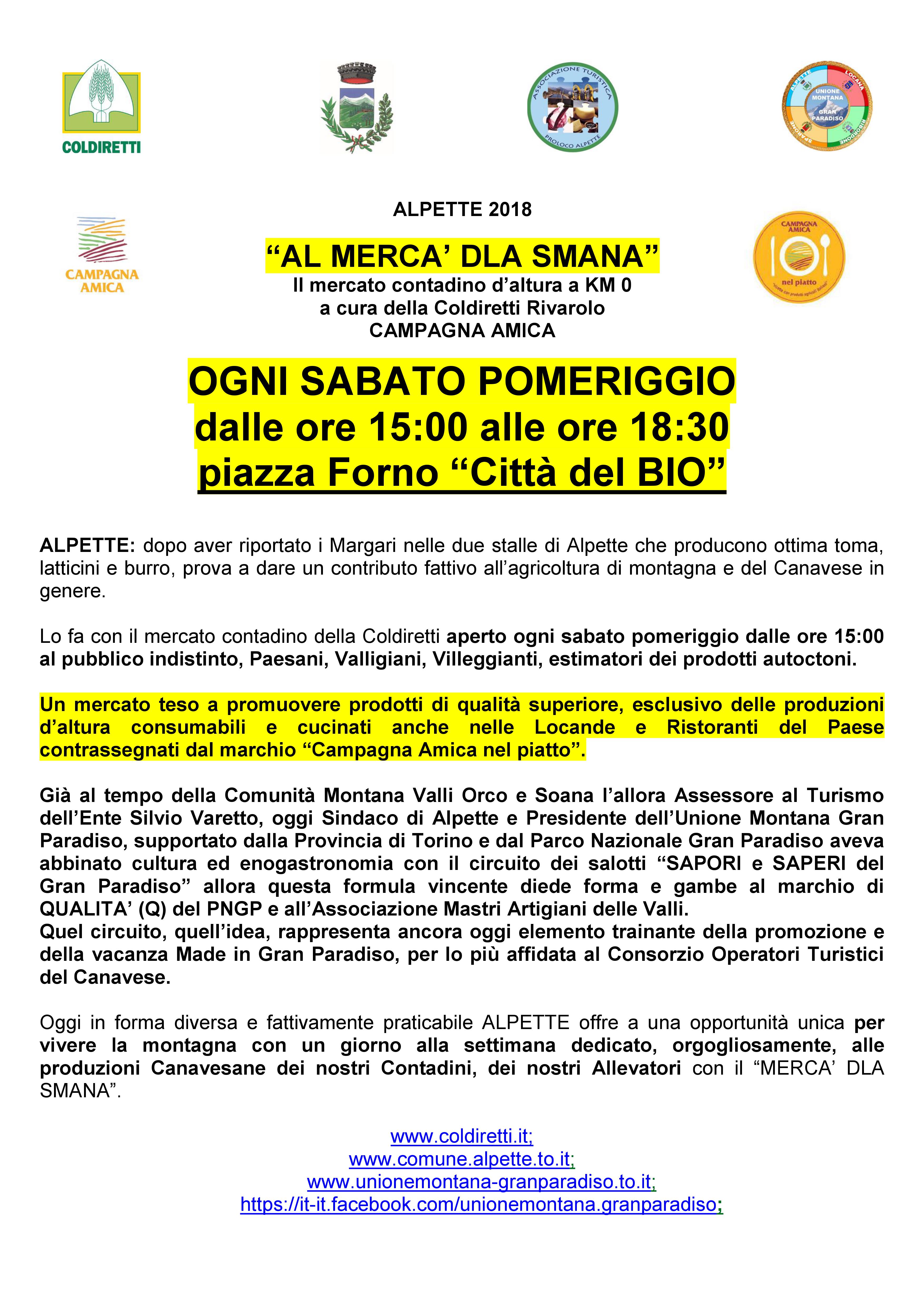 Oggi in forma diversa e fattivamente praticabile ALPETTE offre a una opportunità unica per vivere la montagna con un giorno alla settimana dedicato, orgogliosamente, alle produzioni Canavesane dei nostri Contadini, dei nostri Allevatori con il “MERCA’ DLA SMANA”.