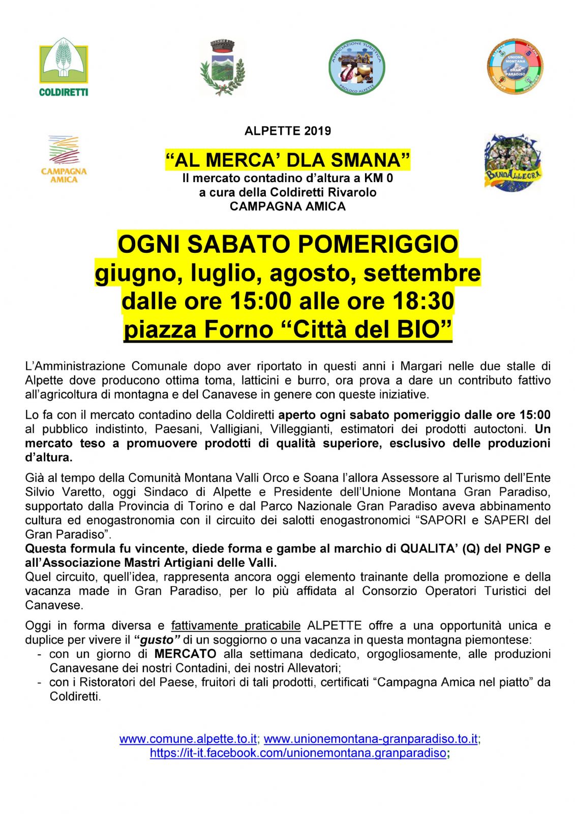 Lo fa con il mercato contadino della Coldiretti aperto ogni sabato pomeriggio dalle ore 15:00 al pubblico indistinto, Paesani, Valligiani, Villeggianti, estimatori dei prodotti autoctoni. Un mercato teso a promuovere prodotti di qualità superiore, esclusivo delle produzioni d’altura.