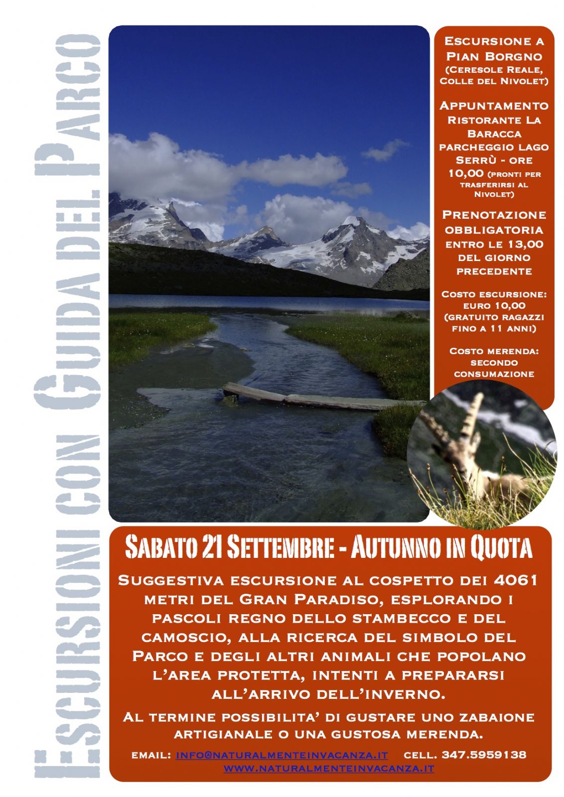 Suggestiva escursione al cospetto dei 4061 metri del Gran Paradiso, esplorando i pascoli regno dello stambecco e del camoscio, alla ricerca del simbolo del Parco e degli altri animali che popolano l'area protetta, intenti a prepararsi all'arrivo dell'inverno.