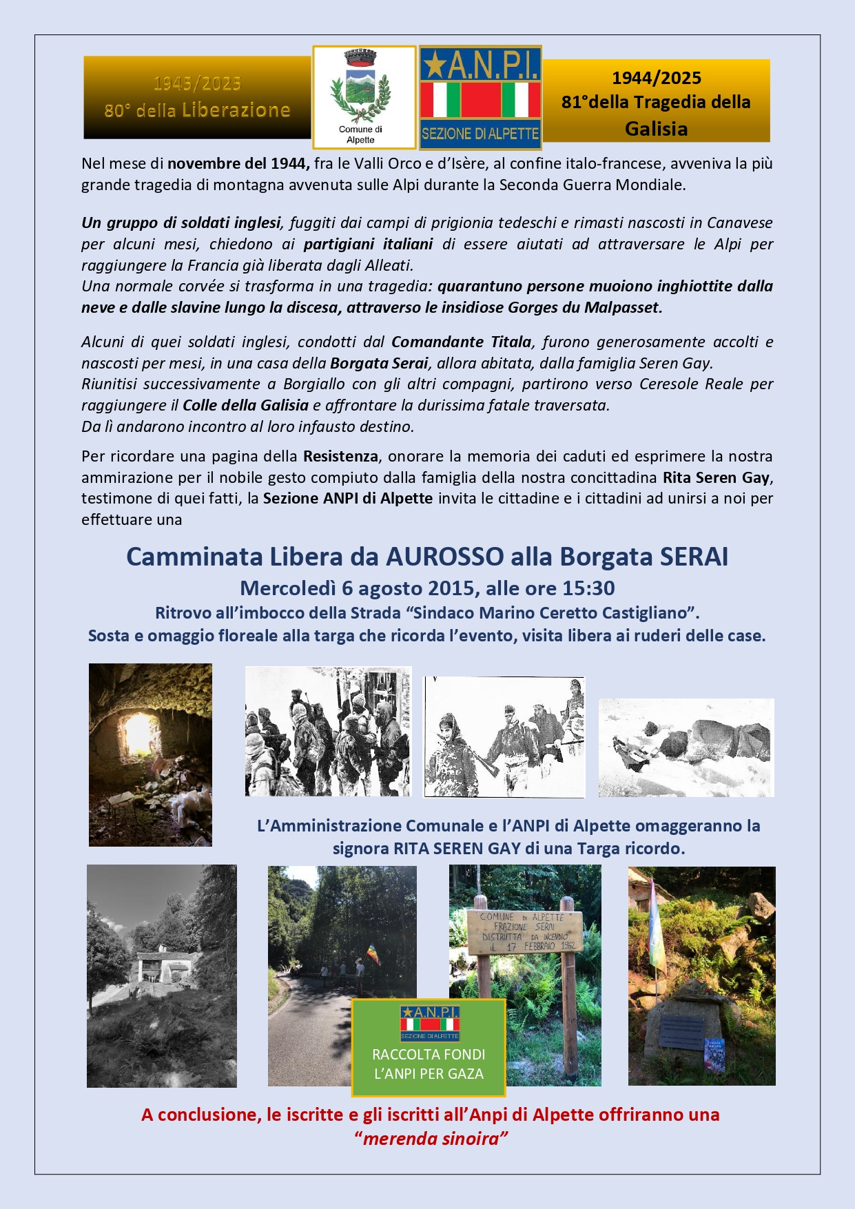 Evento organizzato dall'A.N.P.I. - Sezione di Alpette in collaborazione con il Comune di Alpette, per ricordare la tragedia della Galizia, dove nel novembre del 1944, nelle Valli Orco e d'Isère, al confine italo-francese persero la vita 41 soldali inglesi che fuggiti dai campi di prigionia tedeschi e rimasti nascosti in Canavese, alcuni nascosti nella Borgata Serai dalla famiglia Seren Gay, e accompagnati dai partigiani italiani, tentarono di attraversare il Colle della Galisia per raggiungere la libertà.