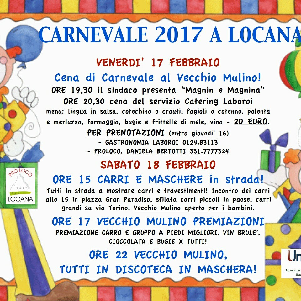 Tutti in strada a mostrare carri e travestimenti! Incontro dei carri alle 15.00 in Piazza Gran Paradiso, sfilata carri piccoli in paese, carri grandi su Via Torino. Vecchio Mulino aperto per i bambini.