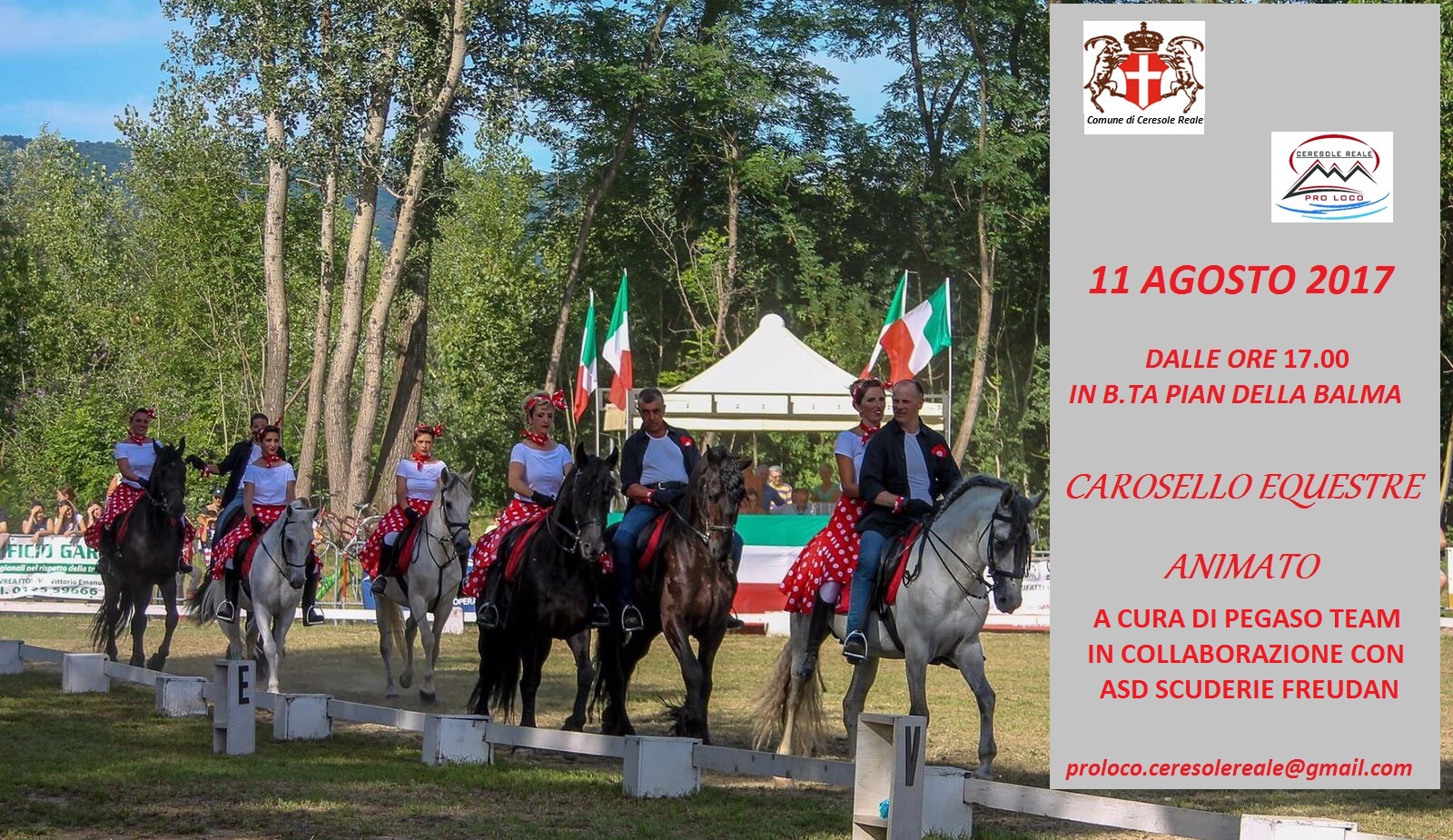 Ore 17.00 in località Pian della Balma carosello animato con 8 cavalli a cura di Pegaso Teame e ASD Scuderie Freudan