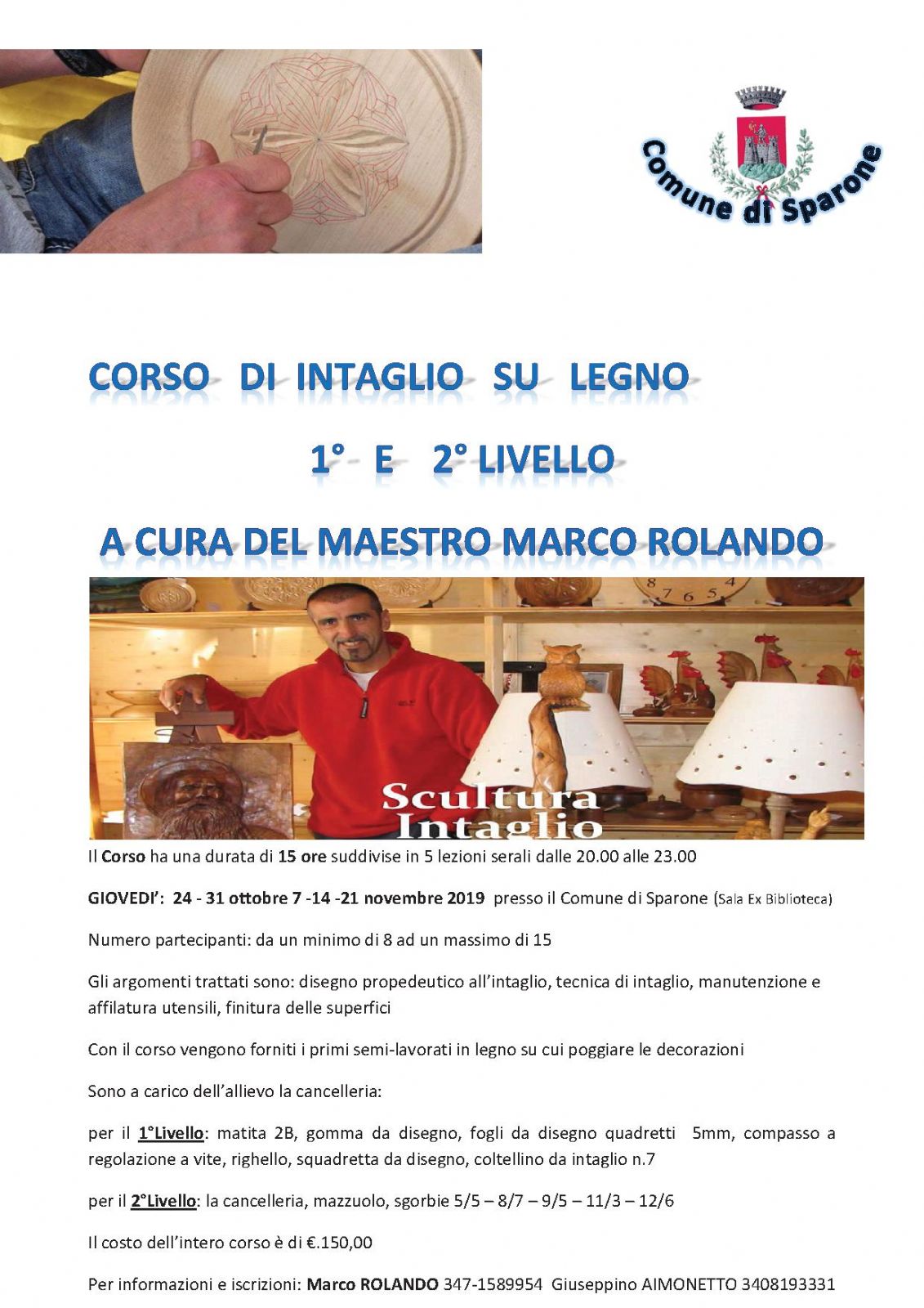 CORSO DI INTAGLIO SU LEGNO 1° e 2° Livello a cura del Maestr Marco ROLANDO
