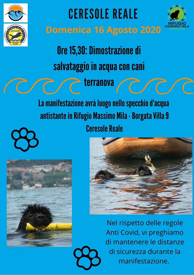 Dimostrazione di salvataggio con i cani terranova. Li vedremo all'opera nelle acque del lago di Ceresole Reale, davanti al Rifugio Mila in Borgata Villa.