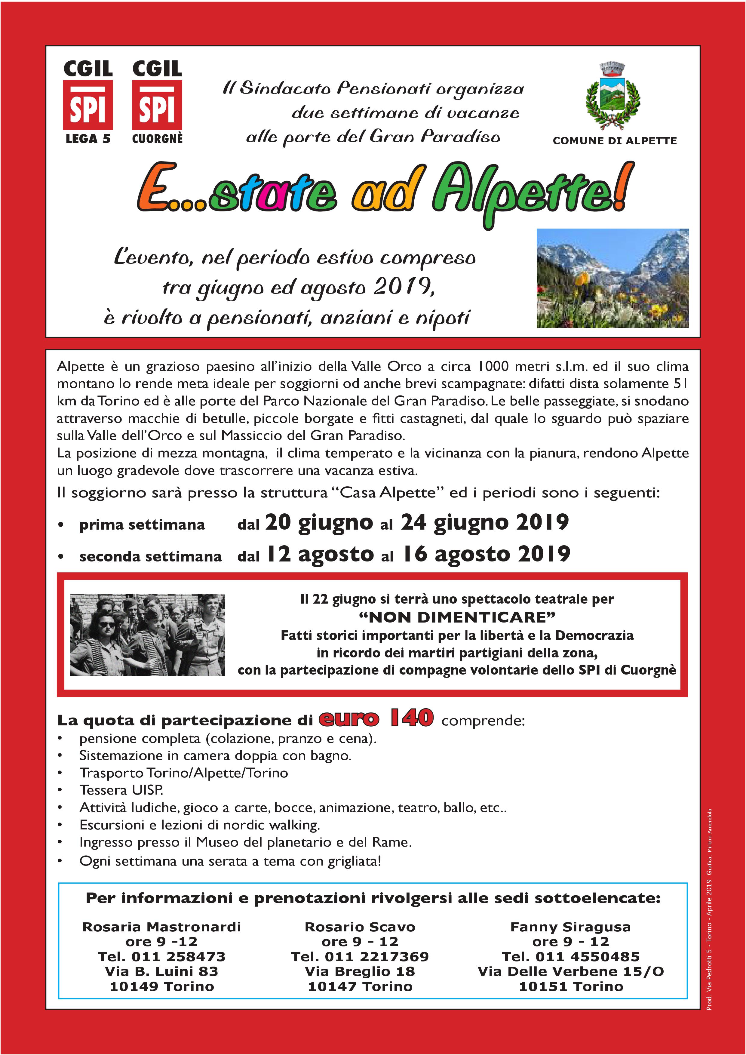 | Organizzazione | Sindacato Pensionati organizza due settimane di vacanze alle porte del Gran Paradiso |