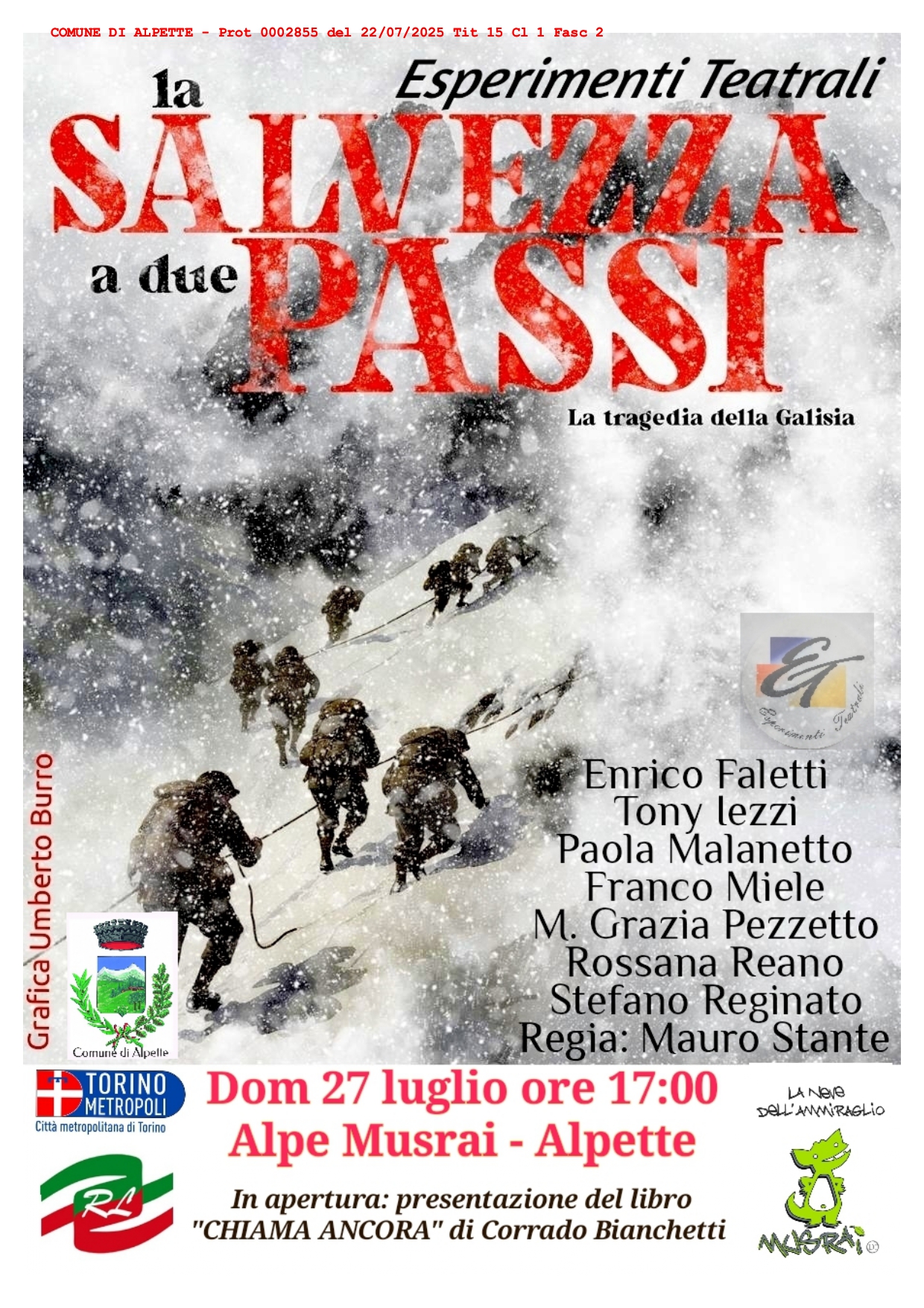 L'Associazione "La Neve dell'Ammiraglio" in collaborazione Esperimenti Teatrali presenta presso la Località Alpe - Musrai - domenica 27 luglio 2025, lo spettacolo "La salvezza a due passi - La tragedia della Galisia"