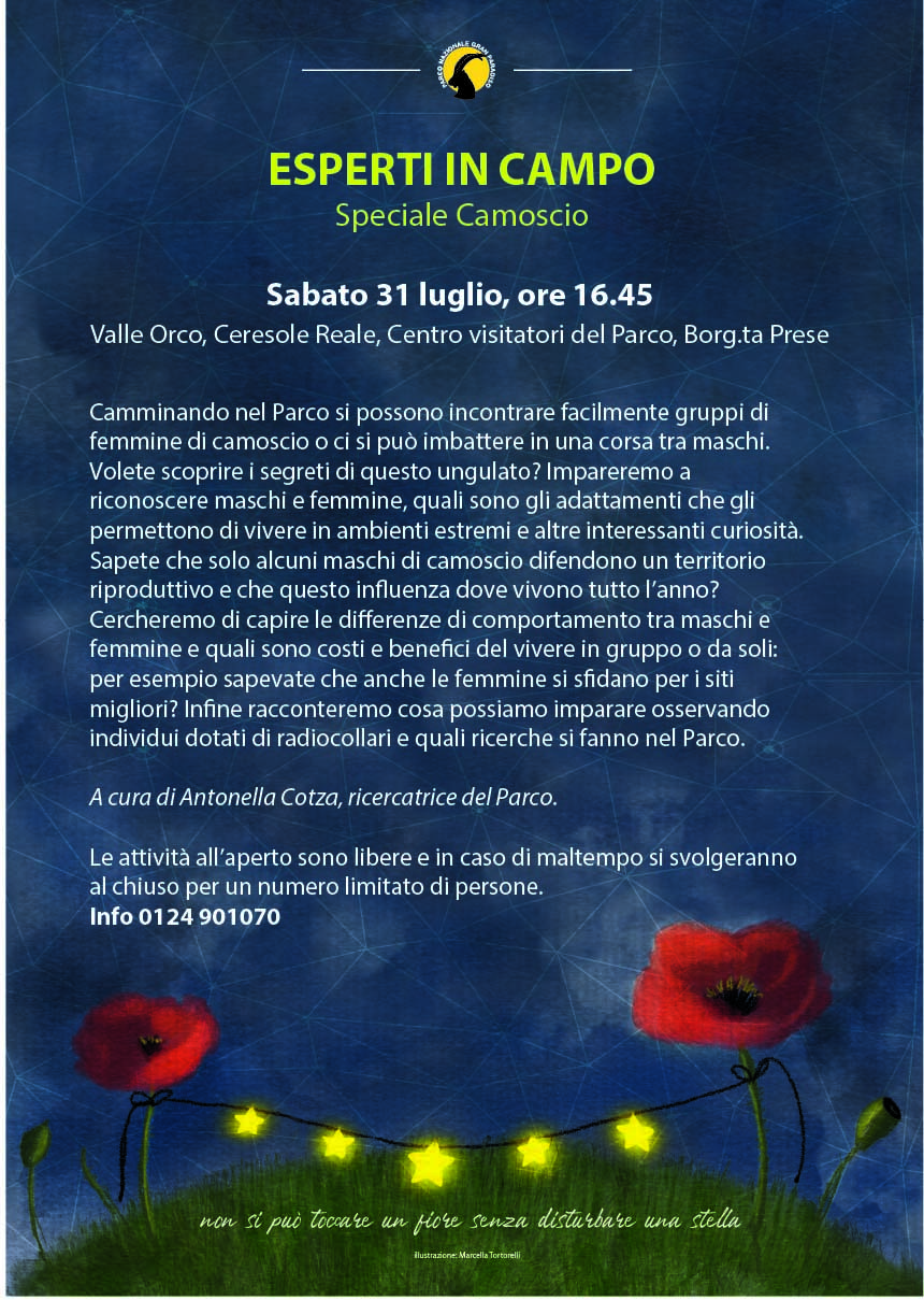 Camminando nel Parco si possono incontrare facilmente gruppi di femmine di camoscio o ci si può imbattere in una corsa tra maschi. Volete scoprire i segreti di questo ungulato? Impareremo a riconoscere maschi e femmine, quali sono gli adattamenti che gli permettono di vivere in ambienti estremi e altre interessanti curiosità. Sapete che solo alcuni maschi di camoscio difendono un territorio riproduttivo e che questo influenza dove vivono tutto l’anno? Cercheremo di capire le differenze di comportamento tra maschi e femmine e quali sono costi e benefici del vivere in gruppo o da soli: per esempio sapevate che anche le femmine si sfidano per i siti migliori? Infine racconteremo cosa possiamo imparare osservando individui dotati di radiocollari e quali ricerche si fanno nel Parco.
