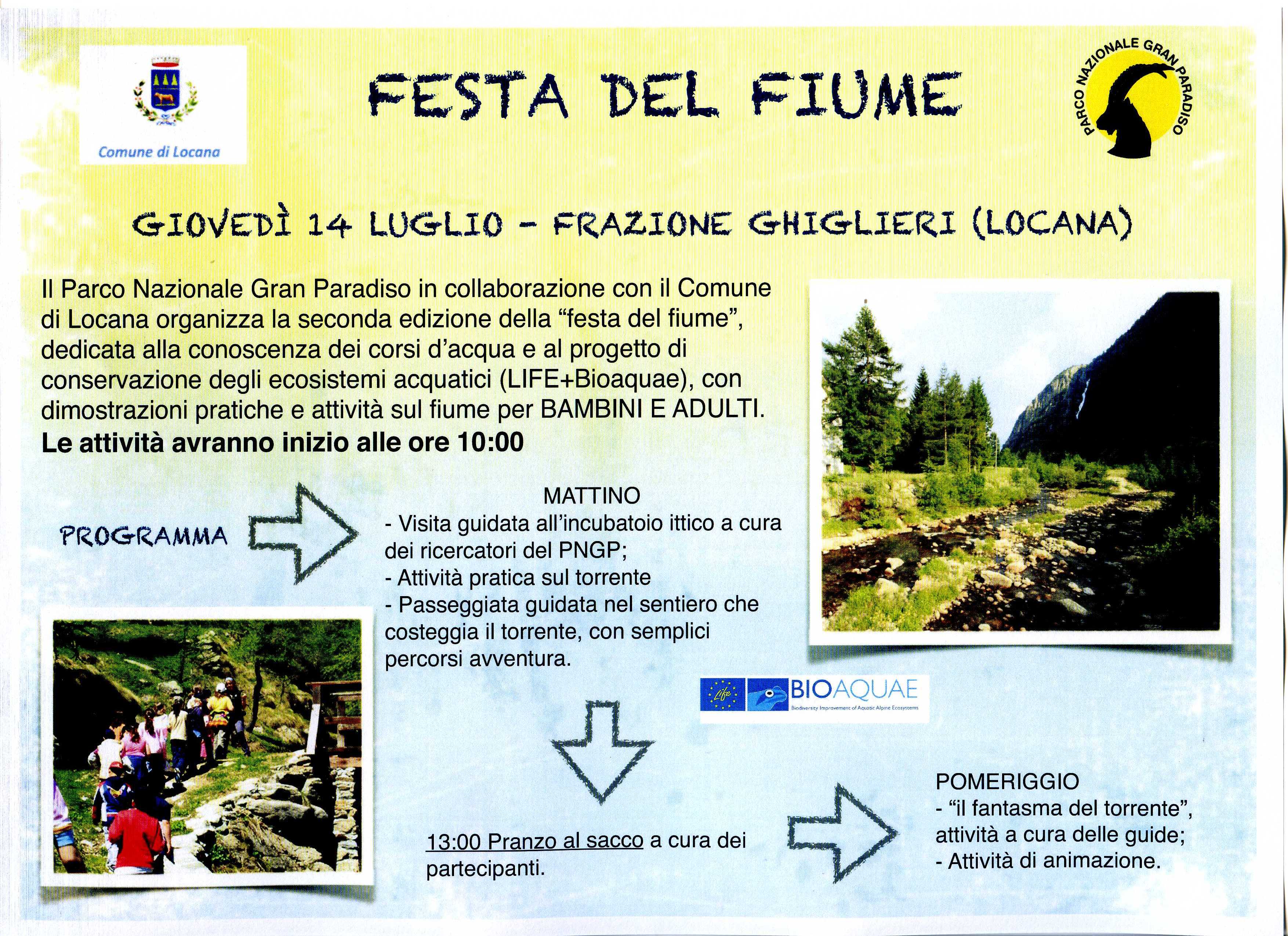 Il Parco Nazionale del Gran Paradiso in collaborazione con il Comune di Locana organizza la seconda edizione della "Festa del Fiume", dedicata alla conoscenza dei corsi d'acqua e al progetto di conservazione degli ecosistemi acquatici (LIFE-Bioaquae), con dimostrazioni pratiche e attività sul fiume per bambini e adulti.