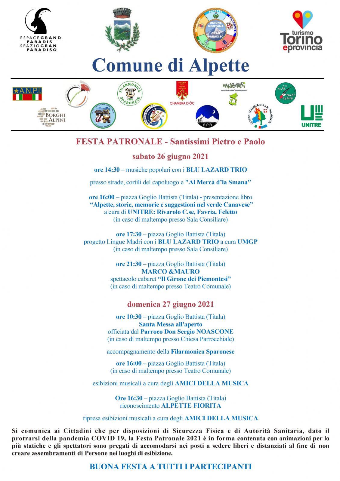 Si comunica ai Cittadini che per disposizioni di Sicurezza Fisica e di Autorità Sanitaria, dato il protrarsi della pandemia COVID 19, la Festa Patronale 2021 è in forma contenuta con animazioni per lo più statiche e gli spettatori sono pregati di accomodarsi nei posti a sedere liberi e distanziati al fine di non creare assembramenti di Persone nei luoghi di esibizione.