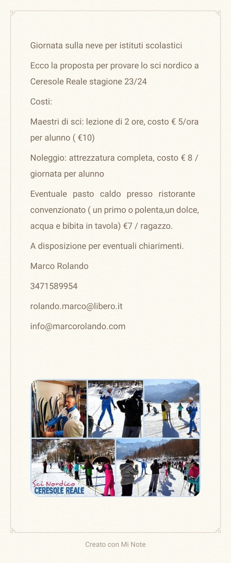 Costo noleggio attrezzatura completa: 8,00 euro ad alunno (giornata intera)