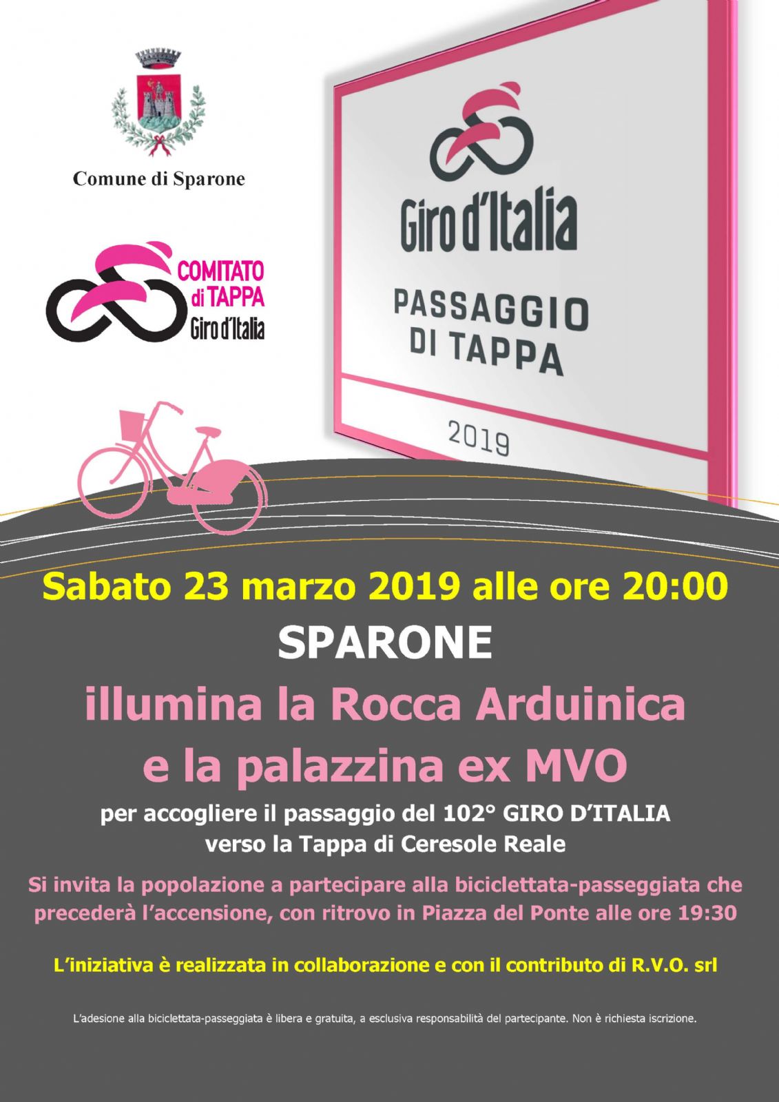 SABATO 23 MARZO 2019 ORE 20.00 SPARONE ILLUMINA LA ROCCA ARDUINICA E LA PALAZZINA EX MVO per accogliere il passaggio del 102° GIRO D'ITALIA verso la Tappa di Ceresole Reale.