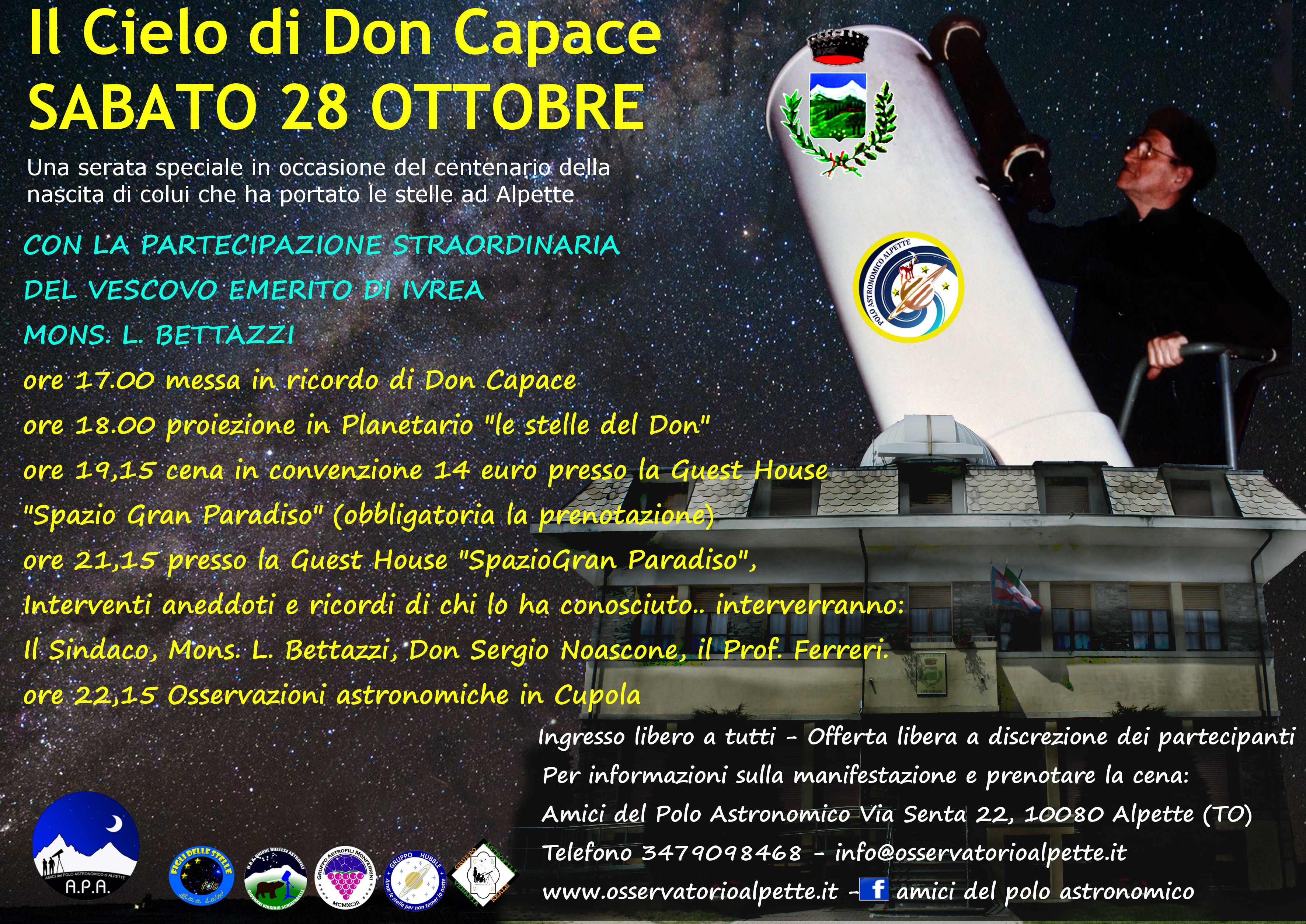Al Polo Astronomico di Alpette, intitolato al parroco Don Giovanni Capace, va in scena sabato 28 ottobre a partire dalle ore 17:00 una serata molto speciale, dal titolo "il cielo di Don Capace" tra Fede e Passione. Una iniziativa voluta dall'Amministrazione Comunale a 100 anni dalla nascita del Parroco che negli anni '70 inizio la visone dei corpi celesti dal cielo della canonica di Alpette. A curare la serata è stata incaricata l'Associazione locale Amici del Polo Astronomico (A.P.A.) che gestisce con competenza e grande professionalità il Polo scientifico affidatole dal Comune nel 2013.