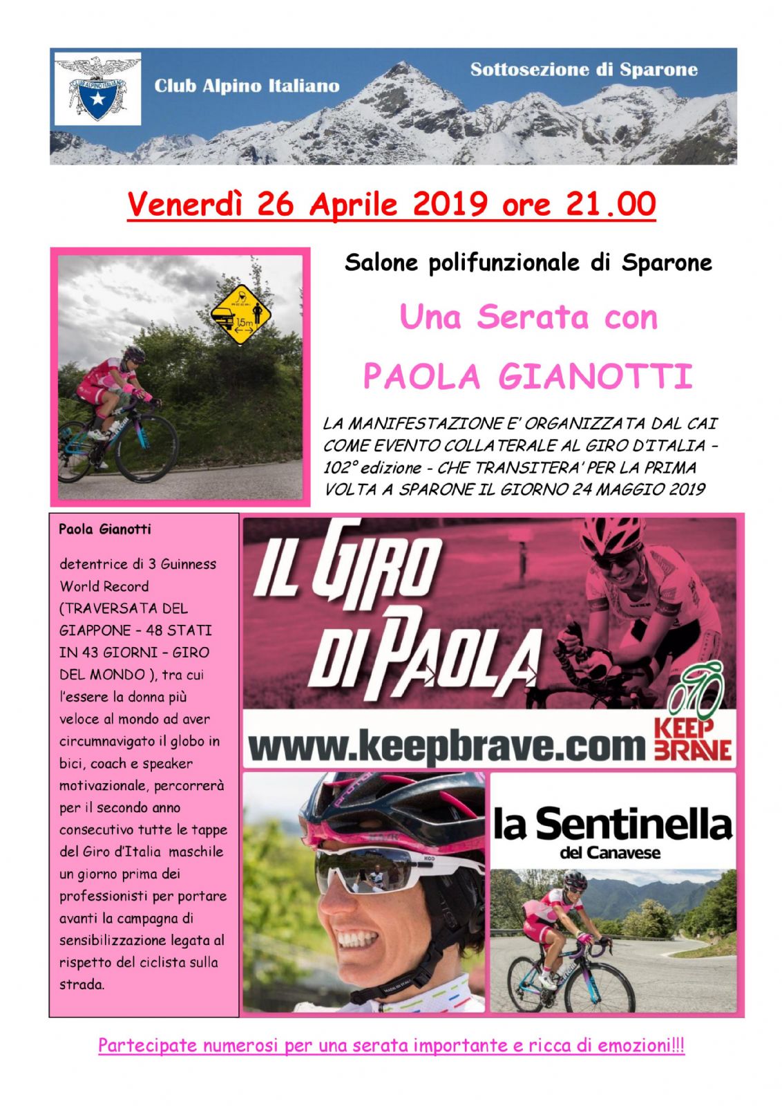 Venerdì 26 aprile 2019 ore 21.00 - Una serata con PAOLA GIANOTTI - Salone Polifunzionale di Sparone - La Manifestazione è organizzata dal CAI come evento collaterale al Giro d'Italia - 102°Edizione..che transiterà per la prima volta a Sparone il giorno 24 maggio 2019