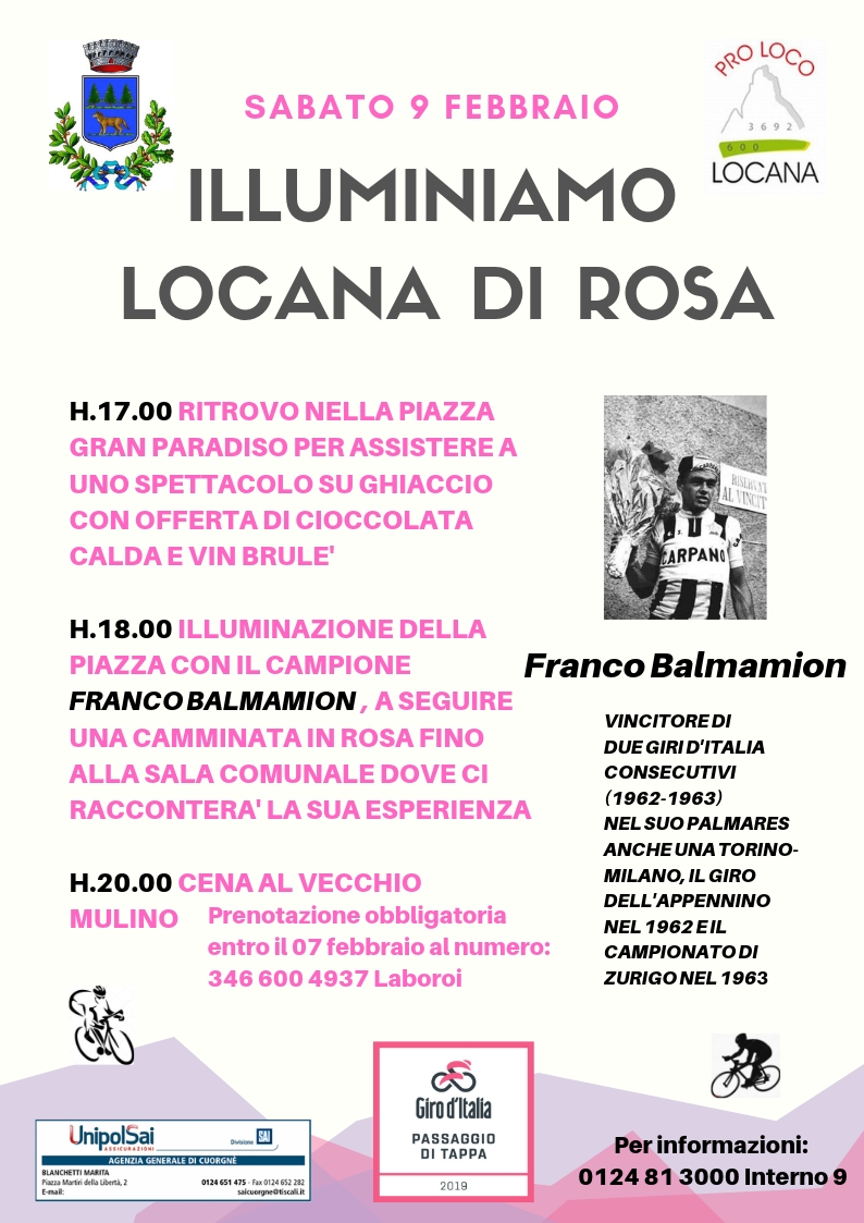 Ore 18.00 - Illuminazione della Piazza con il campione FRANCO BALMAMION, a seguire una camminata in rosa fino alla sala comunale dove ci racconterà la sua esperienza.