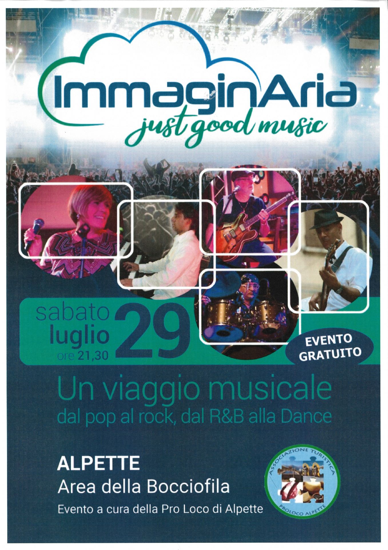 Sabato 29 luglio alle ore 21:30 presso Bocciofila di Alpette si terrà il concerto immaginaria, un viaggio musicale dal Pop al Rock, dal R&B alla Dance - a cura della pro-loco di alpette, locandina in allegato.