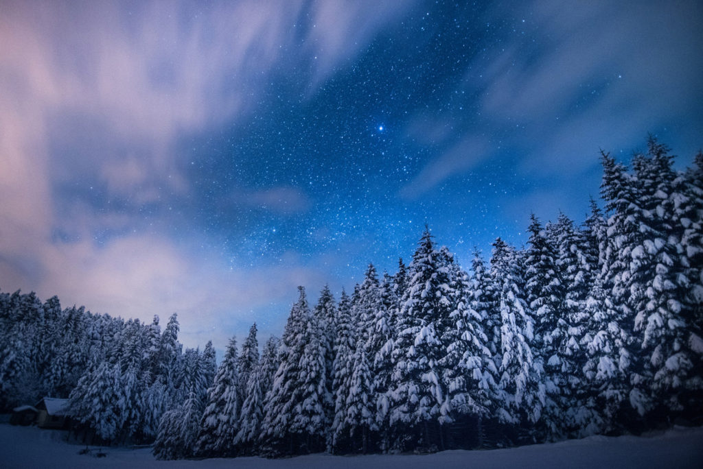 La notte, i passi delle ciaspole sulla neve soffice, il cielo stellato d'inverno poi il piacere di