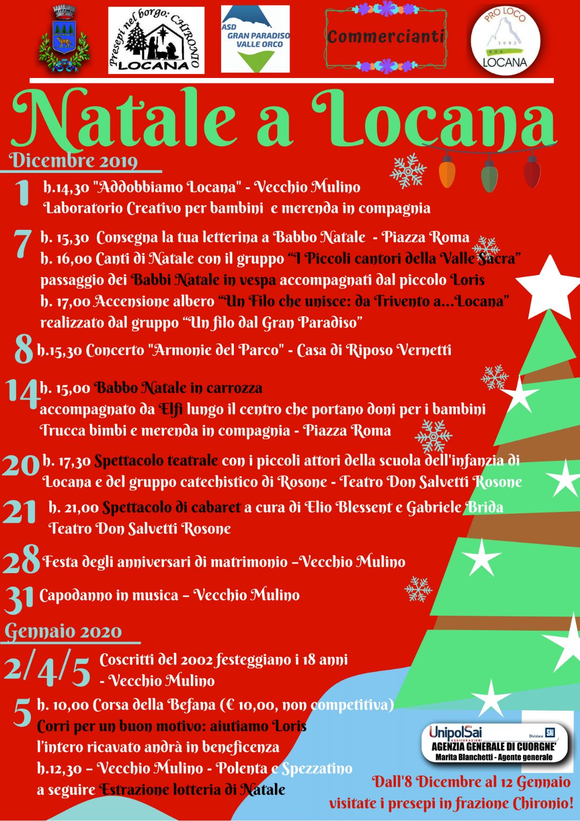 | Organizzazione | Comune di Locana, Proloco Locana, Commercianti, Presepi nel borgo: Chironio, ASD Gran Paradiso Valle Orco |