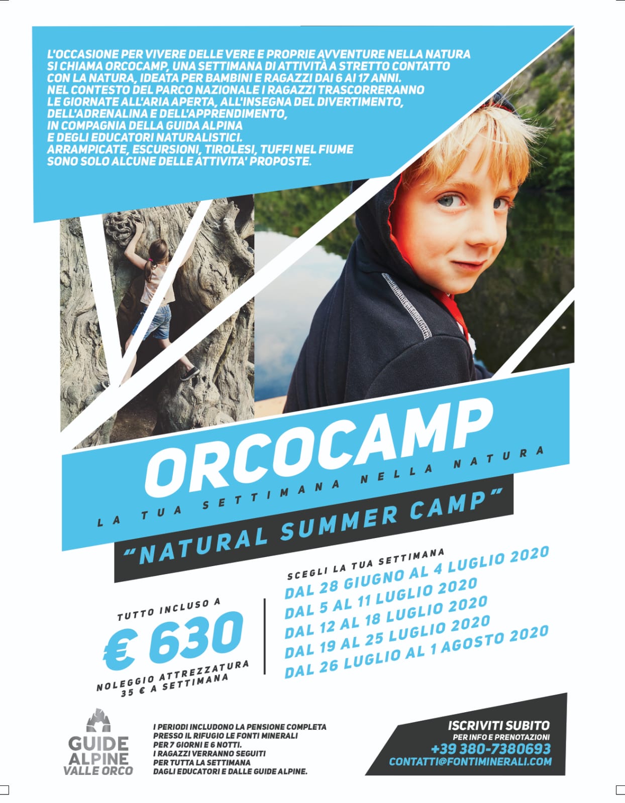 I ragazzi trascorreranno le giornate all'aria aperta all'insegn del divertimento, dell'adrenalina e del divertimento in compagnia della Guida Alpina e degli educatori naturalistici: arrampicate, escursioni, tirolesi, tuffi nel fiume... sono solo alcune delle attività proposte.