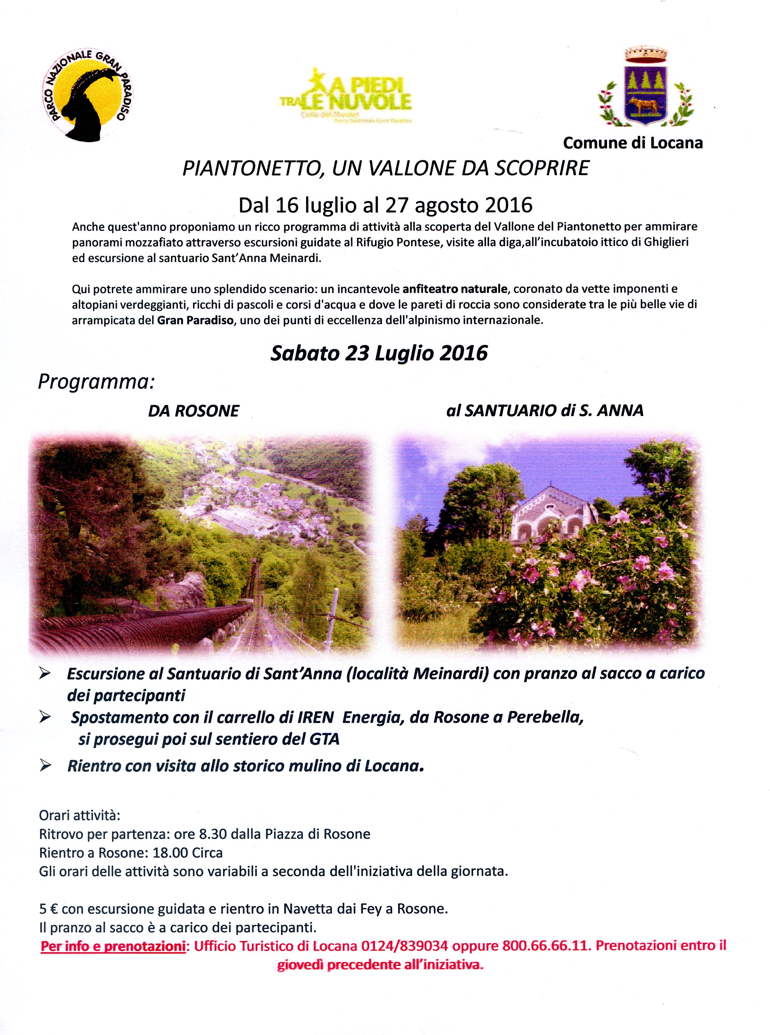Anche quest'anno proponiamo un ricco programma di attività organizzato con la Pro loco e il Comune di Locana, che vi porterà, i sabati di luglio e agosto, in navetta nel vallone di Piantonetto, parte integrante dell'itinerario Giroparco Gran Paradiso, per ammirare panorami mozzafiato attraverso escursioni guidate al rifugio Pontese, visite alla diga, all'incubatoio ittico di Ghiglieri ed escursioni al santuario di Sant'Anna.