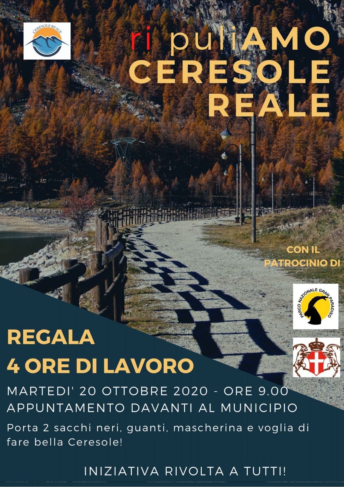 Porta 2 sacchi neri, guanti, mascherina e voglia di fare bella Ceresole!